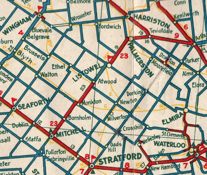 (See Map). Provincial Highway 23 was renamed King's Highway 23 in 1930. At the time of assumption in 1927, Highway 23 was gravel-surfaced for its entire length. Paving work began on Highway 23 in 1930 and was completed when the final gravel section north of Atwood was paved in 1933. With the completion of Highway 23 between Mitchell and Teviotdale, the Department of Highways of Ontario (DHO) turned their attention to the south. In 1934, Highway 23 was extended south from Mitchell to Elginfield. Preliminary Route Plans were prepared in June 1934, showed a proposed extension of Highway 23 along the existing Elginfield-Mitchell Road. This road was officially assumed as an extension of Highway 23 by the DHO on July 11, 1934. The 1934 extension added another 37 km (23 miles) to the length of Highway 23 (See Map). The south leg of Highway 23 from Elginfield to Mitchell remained gravel-surfaced until after World War II. Paving was completed between the Highway 83 Junction and Mitchell in 1946 and from Elginfield to the Highway 83 Junction in 1953. No major changes were made to the route of Highway 23 until 1998 (See Map). Effective January 1, 1998, a 9 km portion of Highway 23 from the Highway 89 Junction at Palmerston to the Highway 9 Junction at Teviotdale was transferred to the Counties of Perth and Wellington. The downloaded section of Highway 23 is now known as Wellington Road 123 and Perth Road 93. In late 2004, a 10 km section of Highway 89 within Wellington County from Palmerston to Harriston was renumbered as Highway 23. This highway renumbering added about 10 km to the length of Highway 23. The highway now ends at the Highway 9 Junction in Harriston (See Map). Highway 23 passes through a predominantly rural area, occasionally passing through some small towns and communities along its 98 km route. The principal towns located along the highway are Mitchell, Listowel, Palmerston and Harriston. Highway 23 is a two-lane highway from Elginfield to Harriston. Services along Highway 23 are rather scarce outside of major communities. The speed limit on Highway 23 is 80 km/h (50 mph), unless posted otherwise. Please visit the Highway 23 Mileage Chart page for a list of mileage reference points along Highway 23. Winter Driving Tip: Many sections of Highway 23 north of London are notorious for poor winter road conditions. Sections of the highway are sometimes closed during periods of poor winter weather between Elginfield and Harriston, due to blowing and drifting snow. Blowing snow will often result in zero-visibility conditions. The weather conditions on this highway can deteriorate very rapidly when snowsqualls blow in from nearby Lake Huron. On cold, windy days, it is a good idea to check the Road Closures and Winter Road Conditions pages on the Ministry of Transportation's Website, or verify road conditions by telephone at 1-800-268-4686 or 5-1-1 before using Highway 23 north of London.
