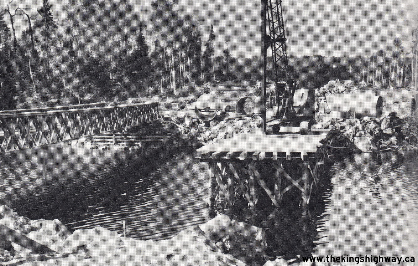Photo at Right: Construction of a new bridge on Hwy 129 at Sideburned Lake southwest of Chapleau (1958)