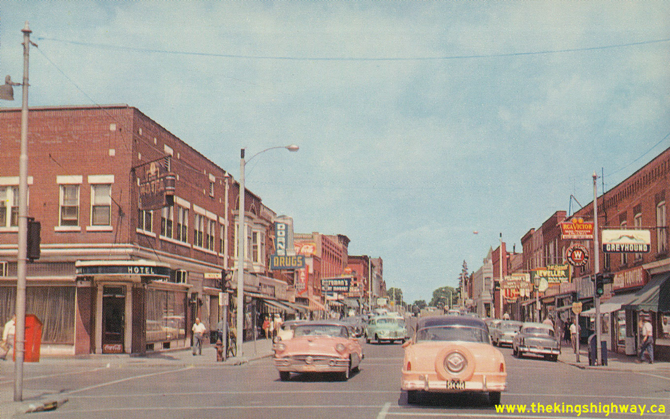 Photo at Right: Circa 1957 postcard view of Erie Street (Hwy 18) in Downtown Leamington