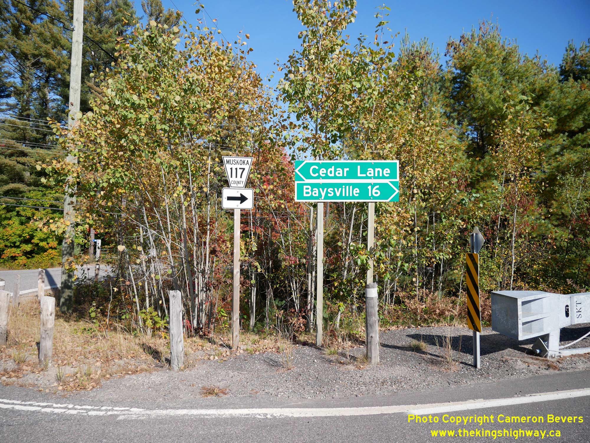 Left - Western terminus of Hwy 117 at the west ramp terminal at the Hwy 11 Interchange. The road ahead is Cedar Lane, which is a municipal street which winds