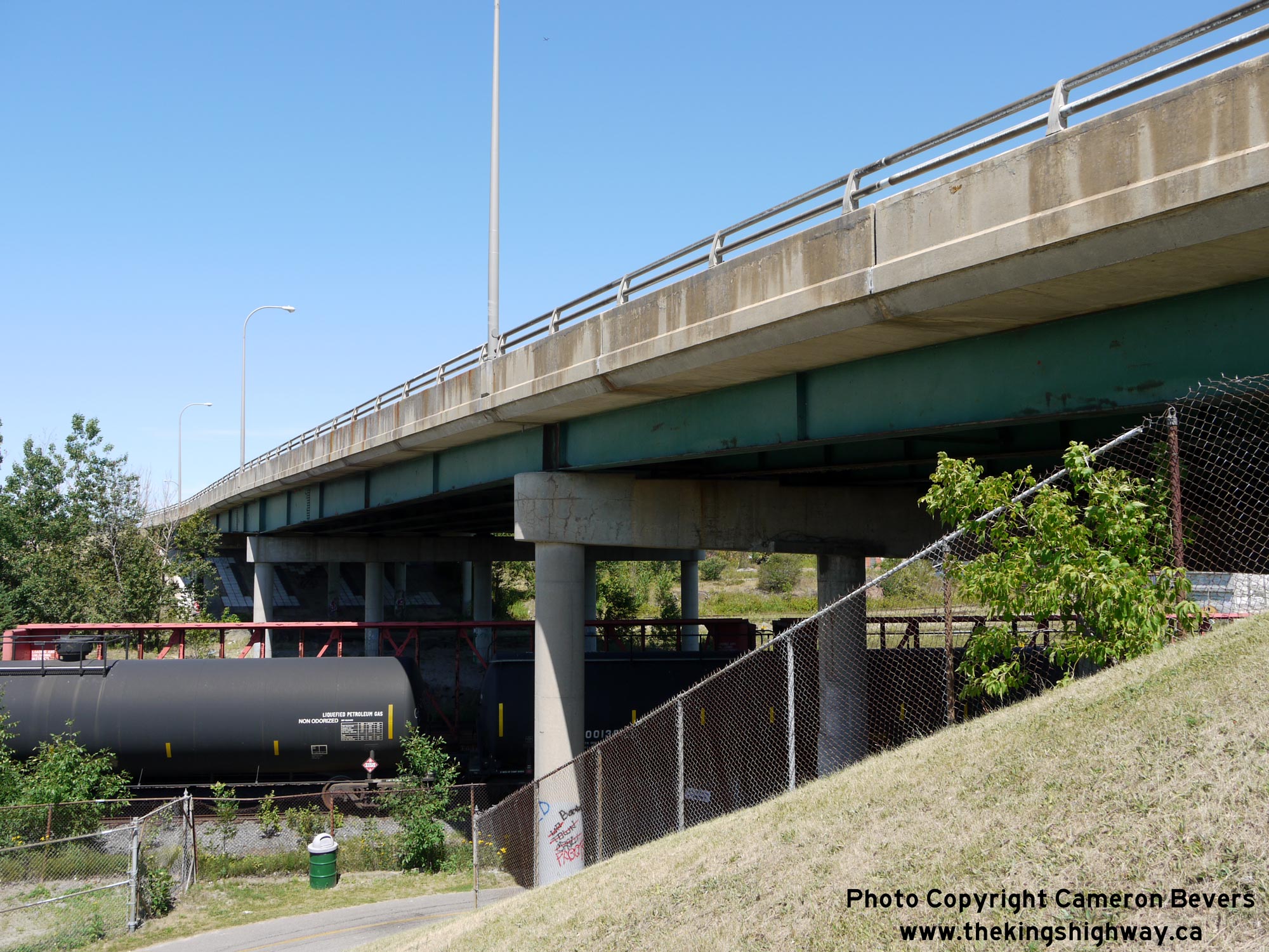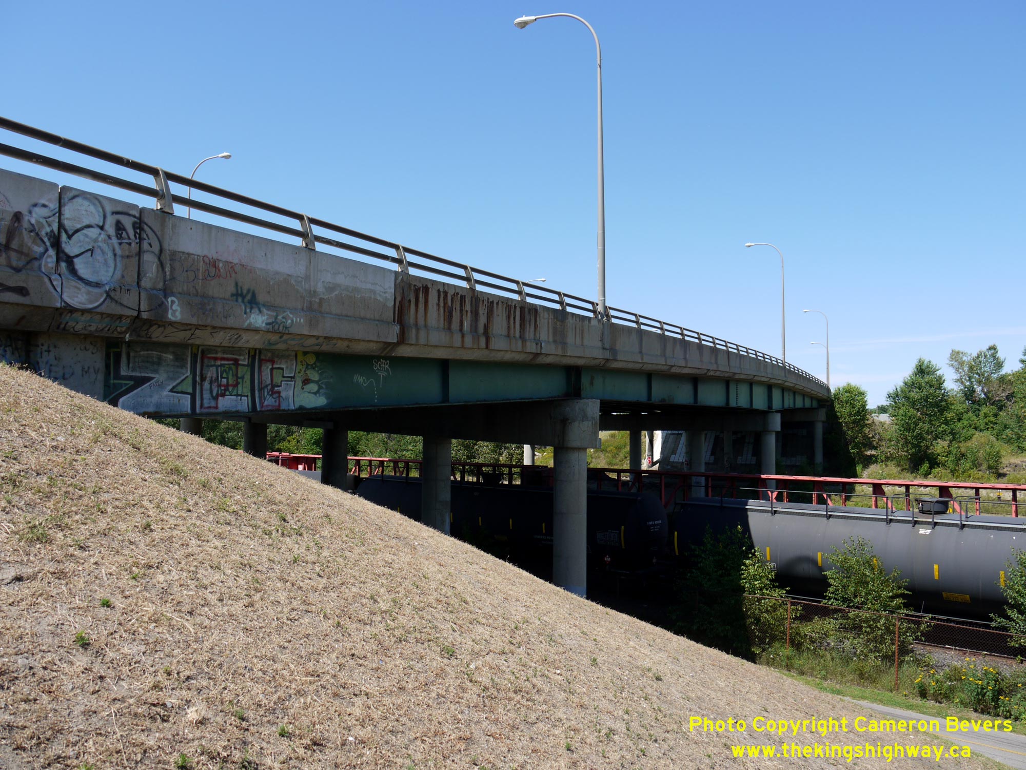Kennedy Avenue) and Stanley Street. See an Enlarged Photo Here. (Photograph taken on July 20, 2012 - © Cameron Bevers) Right - Facing north along Main Street (Hwy 11B) across the North Bay Railway Overhead. Geometrically speaking, this structure is actually quite complicated, with a reverse highway curve and superelevations ingeniously built into the bridge's deck. Whoever designed this structure was especially clever! See an Enlarged Photo Here. (Photograph taken on July 20, 2012 - © Cameron Bevers)