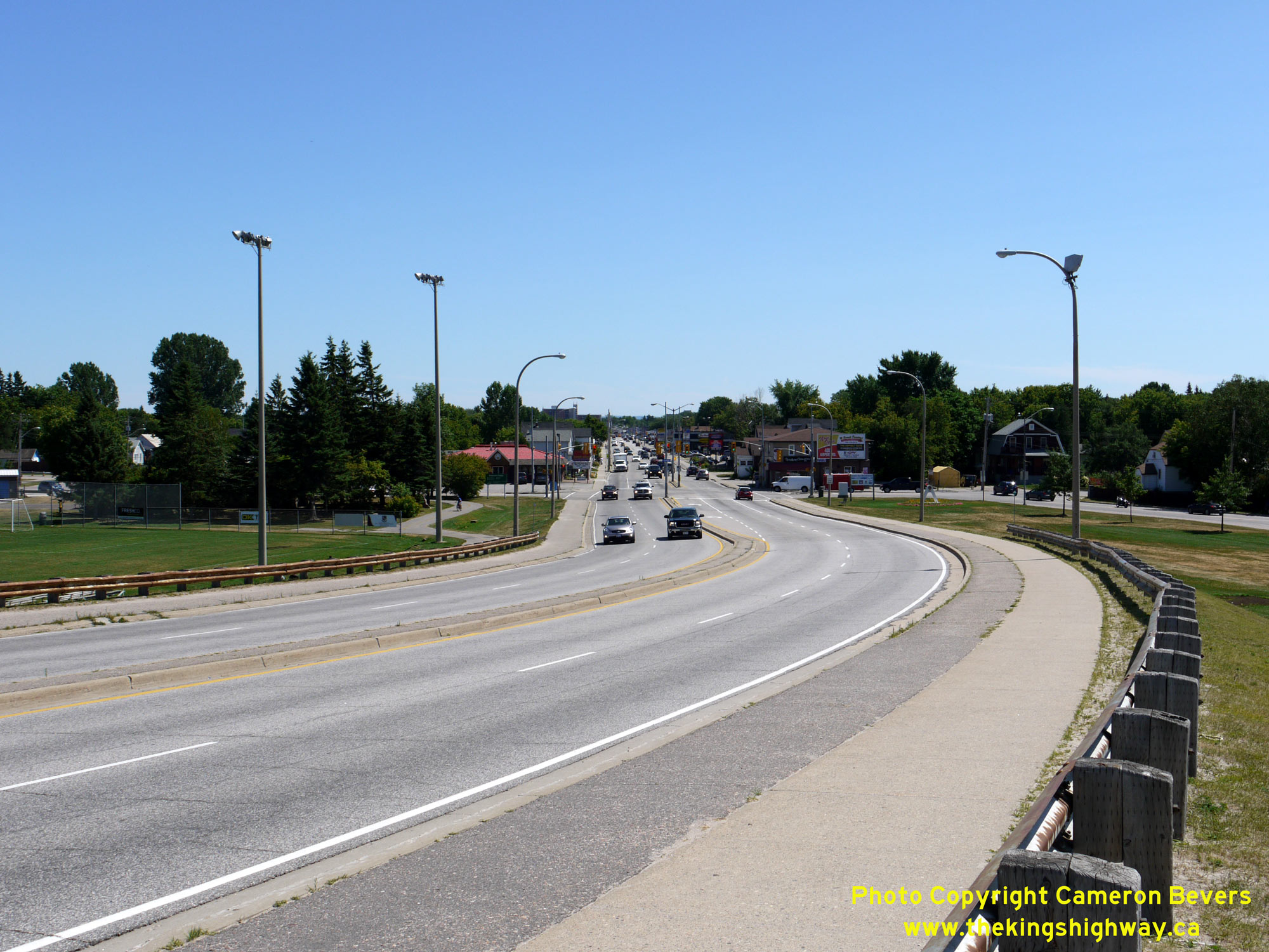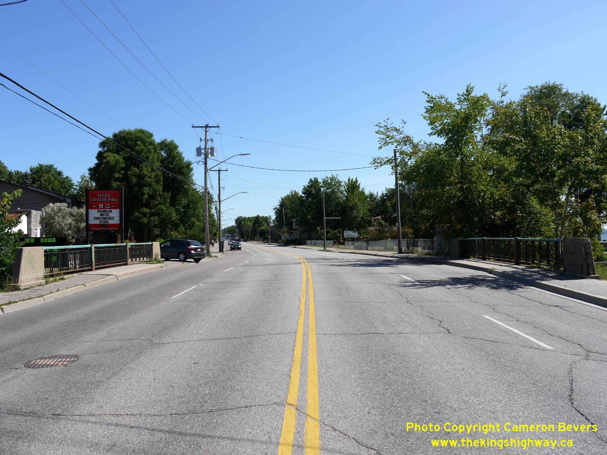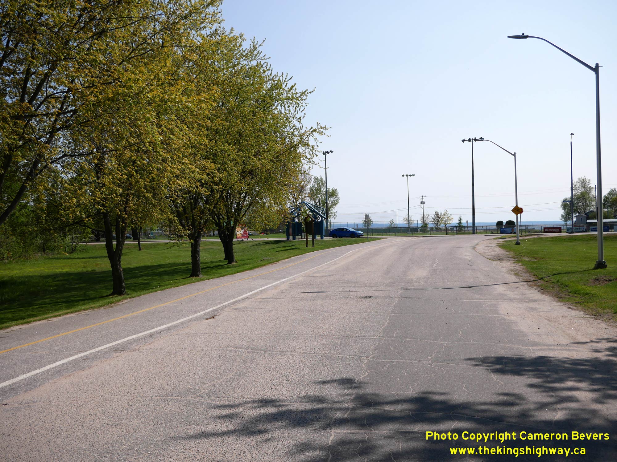 Enlarged Photo Here. (Photograph taken on July 20, 2012 - © Cameron Bevers) Right - Facing south along Lakeshore Drive (Hwy 11B) at the Lavasse River Bridge. The intersection lying just beyond the bridge is Pinewood Park Drive (Old Hwy 11). A bypass was constructed around North Bay in the early 1950s. When the bypass was first completed in 1953, it tied back into the original route of Hwy 11 at this intersection. In order to more clearly differentiate between the original route of Hwy 11 via Downtown North Bay and the new route of Hwy 11 via the North Bay Bypass, the DHO chose to renumber the Downtown North Bay route of Hwy 11 as Hwy 11B in 1958. Today, Lakeshore Drive meets the current freeway route of Hwy 11 at a grade-separated interchange about 350 metres ahead. See an Enlarged Photo Here. (Photograph taken on July 20, 2012 - © Cameron Bevers)