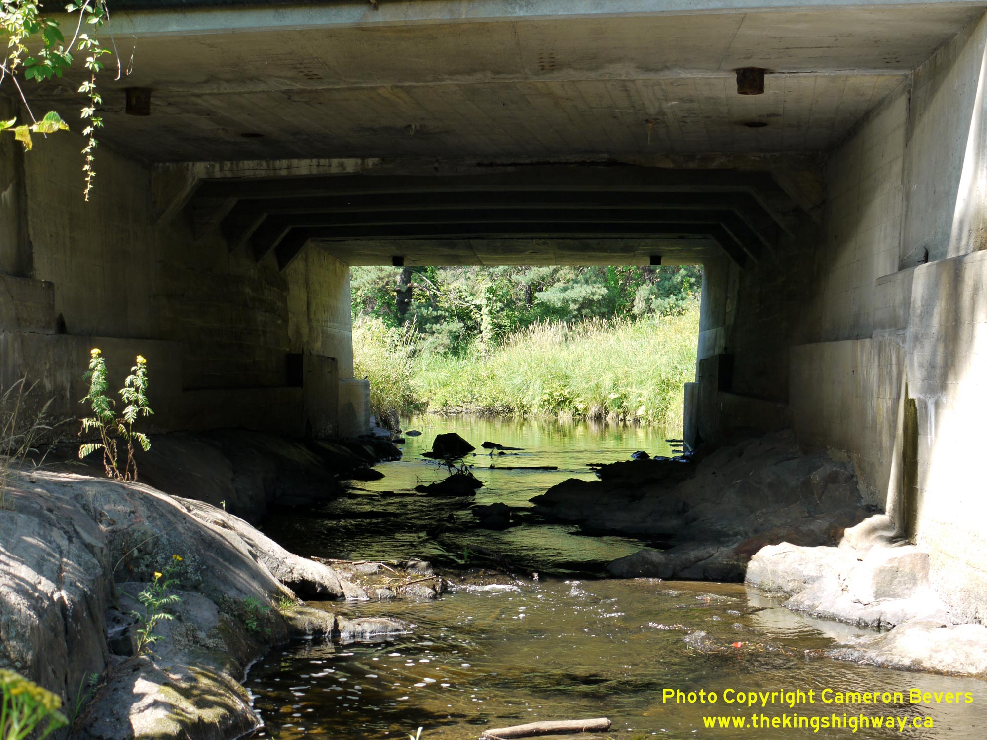 Enlarged Photo Here. (Photograph taken on July 20, 2012 - © Cameron Bevers) Right - Looking through the Lavasse River Bridge on Hwy 11B, observers will note that this bridge has been expanded several times since it was first built for the original Ferguson Highway (which later became Hwy 11) almost a century ago. These progressive expansions reflect the growing importance of the Hwy 11 corridor in the provincial highway system over the years. What started out as a winding gravel road in the 1920s has been upgraded to a four-lane divided freeway today. For early Ontario motorists, the journey from Toronto to North Bay was a full day's drive, and a rather challenging one at that. Thanks to decades of highway investments and improvements, this same journey can be completed rather comfortably today in about three hours. See an Enlarged Photo Here. (Photograph taken on July 20, 2012 - © Cameron Bevers)