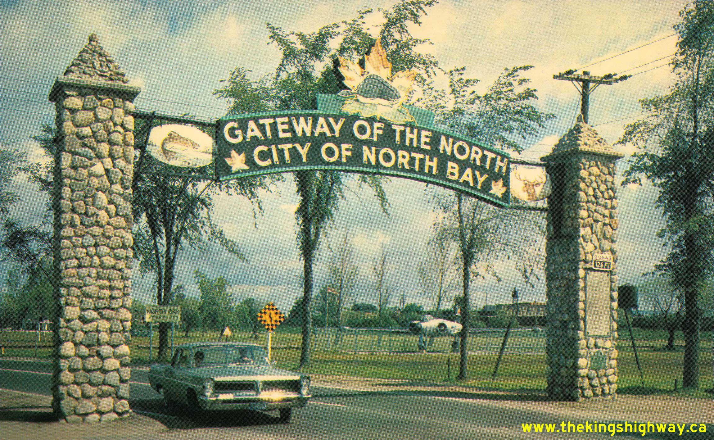 ![]() Left - Circa 1963 postcard view of the North Bay Welcome Arch on Hwy 11B approaching Downtown North Bay. See an