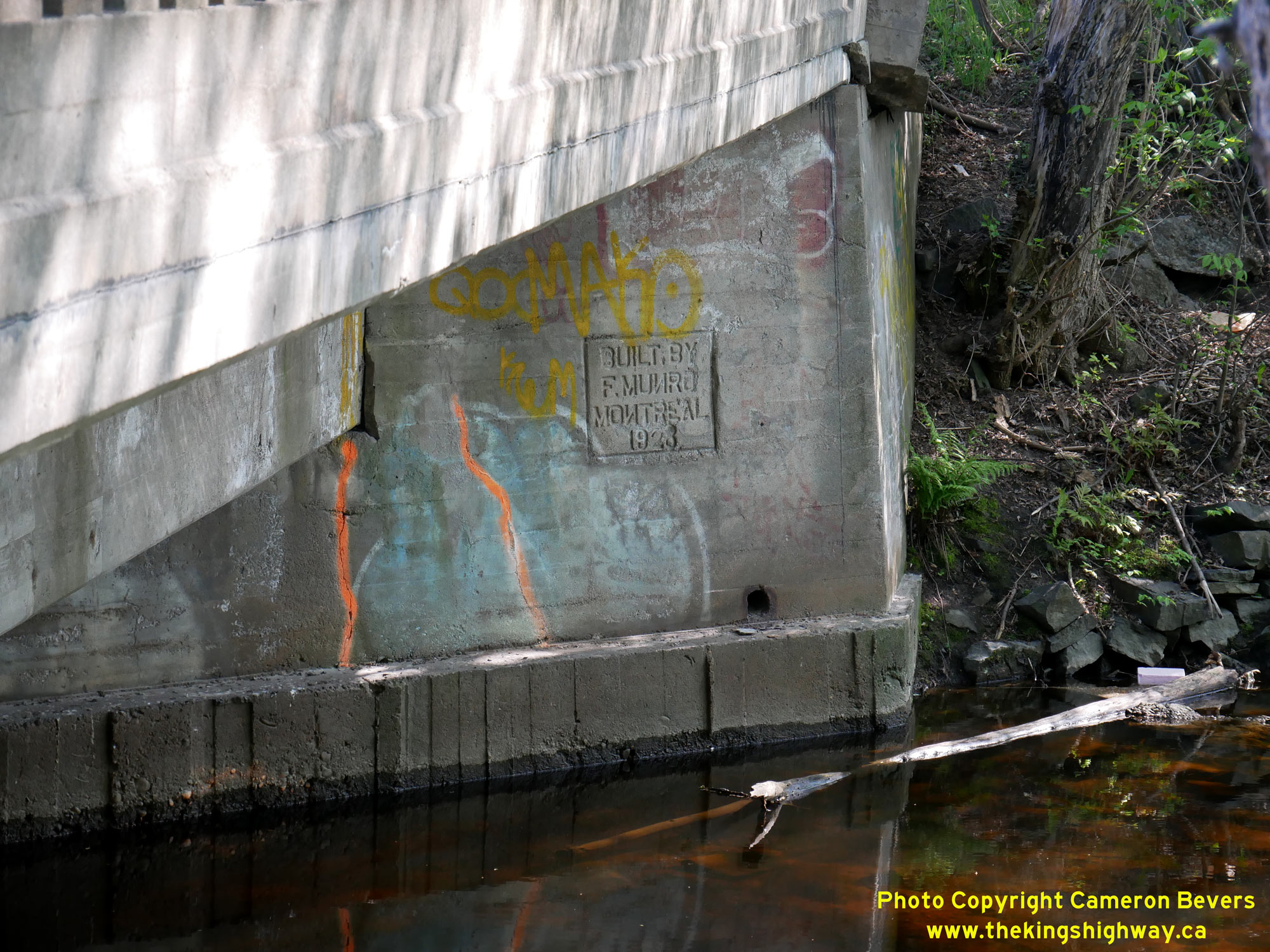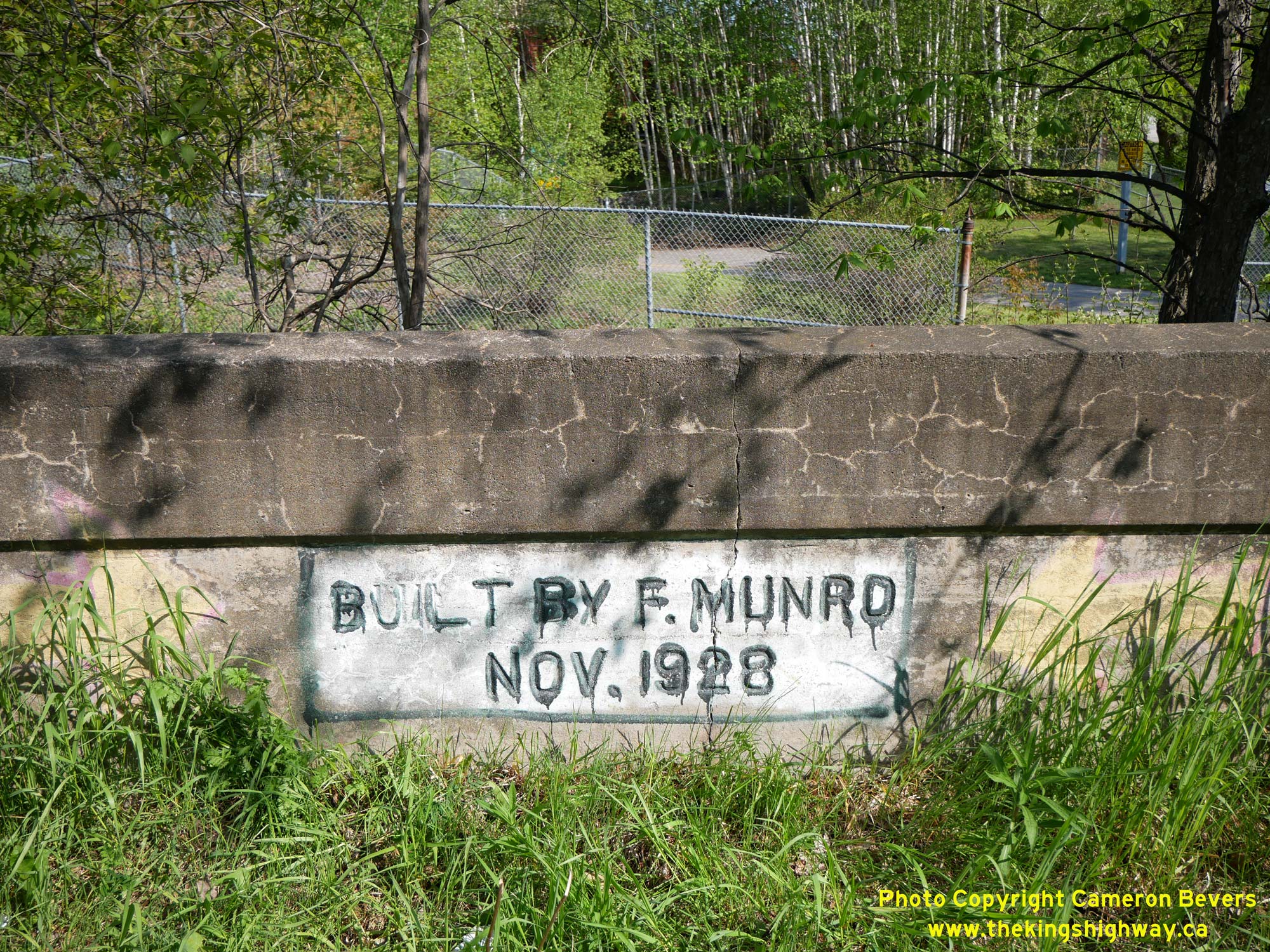 Enlarged Photo Here.(Photograph taken on May 27, 2023 - © Cameron Bevers) Right - Builder's information panel stamped into the concrete handrail of the Chippewa Creek Bridge - "BUILT BY F. MUNRO NOV. 1928". See an