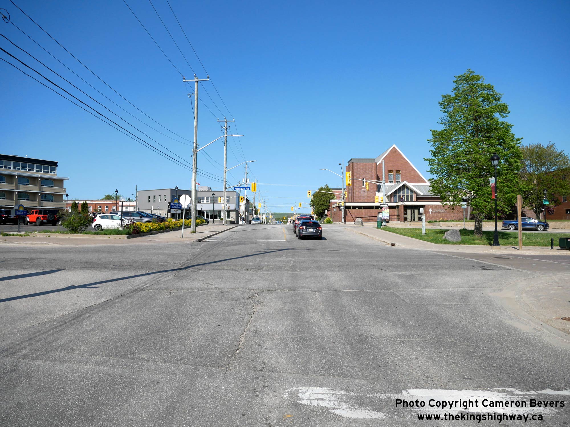 beside the church, where the northbound route of Hwy 11B via McIntyre Street ties back into Algonquin Avenue. See an