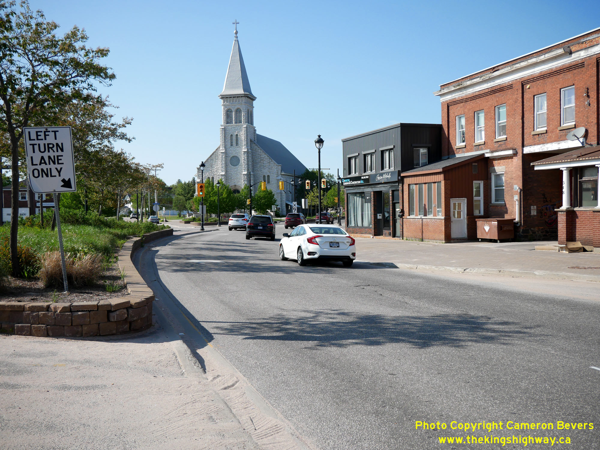 continues north via Algonquin Avenue and returns to the North Bay Bypass, which lies about 2 km ahead. The Pro-Cathedral of the Assumption, completed in 1905, forms