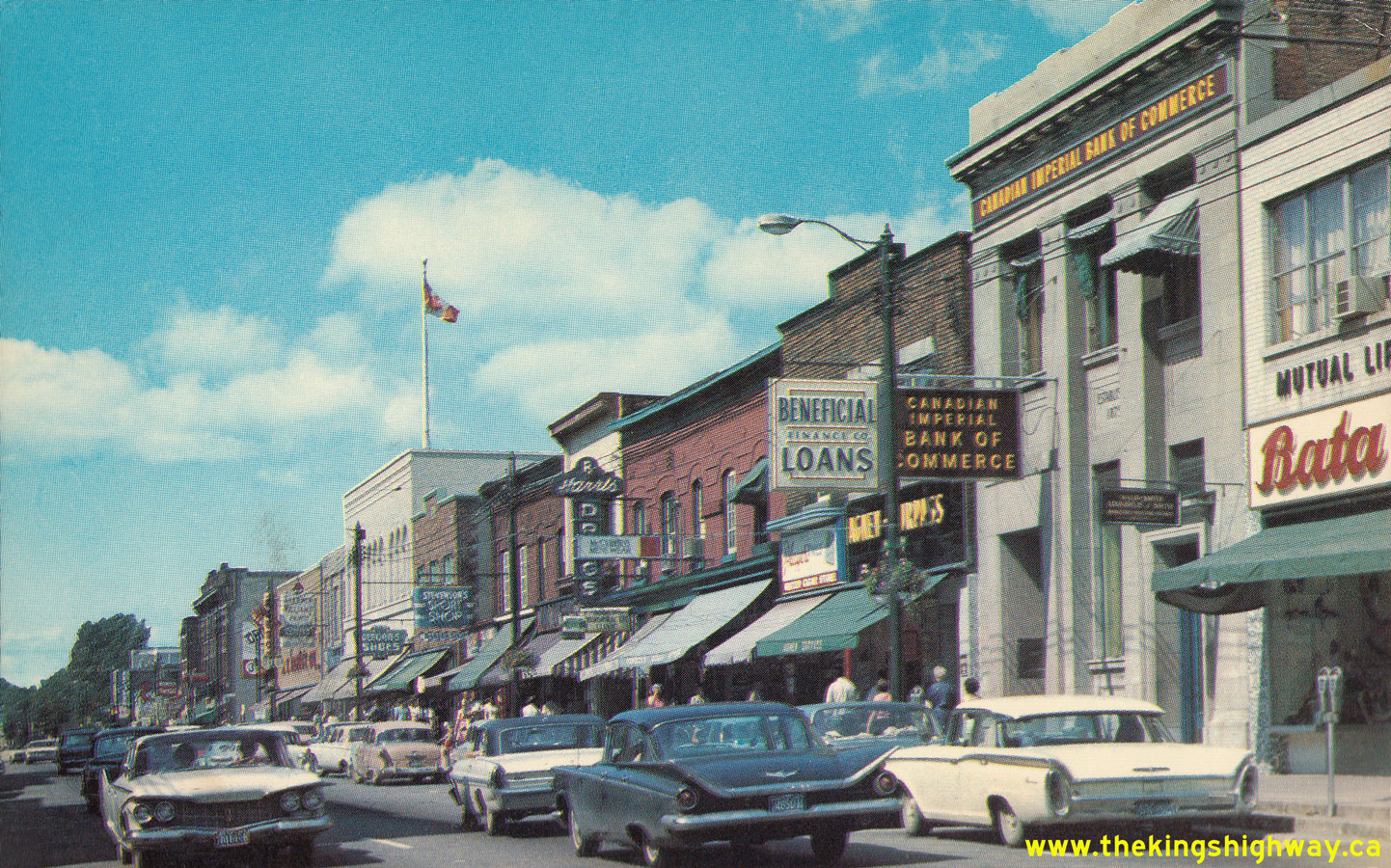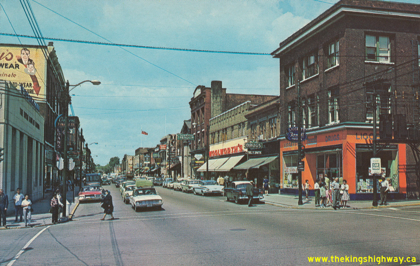 Enlarged Photo Here.(Photo courtesy of Len Leiffer) Right - Circa 1964 postcard view of Main Street (Hwy 11B & Hwy 17B), facing north from Ferguson Street in Downtown North Bay. See an
