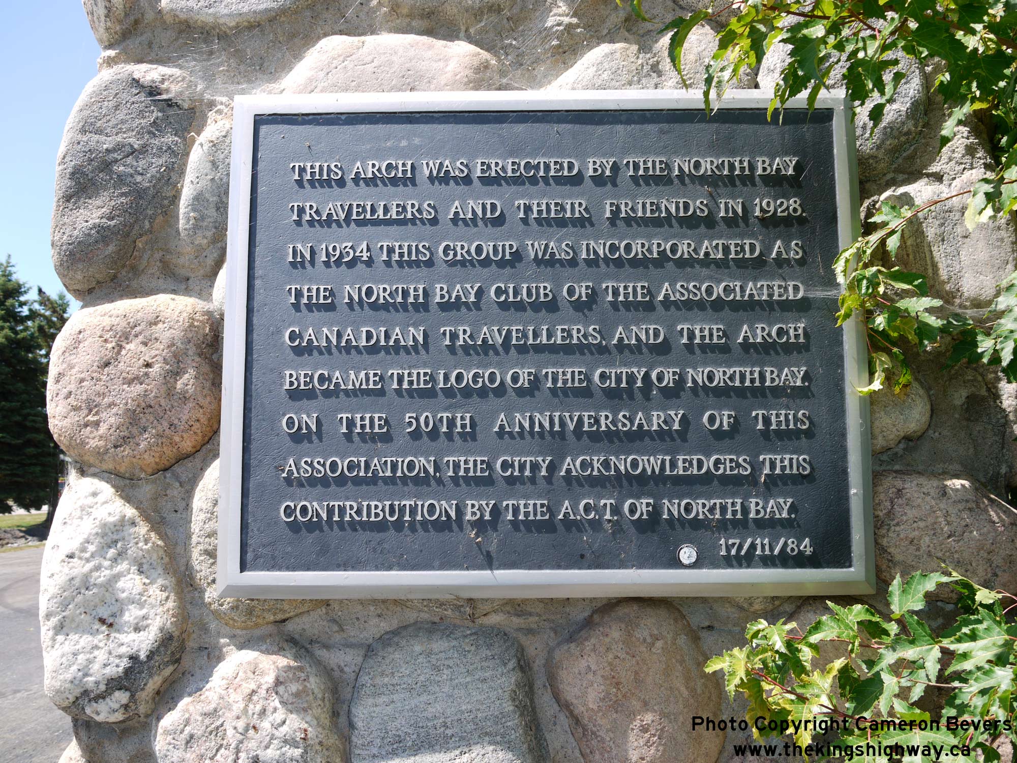 Enlarged Photo Here. (Photograph taken on July 20, 2012 - © Cameron Bevers) Right - North Bay Gateway Arch as it stands today in Lee Park. Although the arch has been modified several times since it was first erected in 1928, it still consists of the same general features as it did decades ago. However, the neon tube lettering on the sign was removed during restoration work carried out on the arch. See an Enlarged Photo Here. (Photograph taken on July 20, 2012 - © Cameron Bevers)