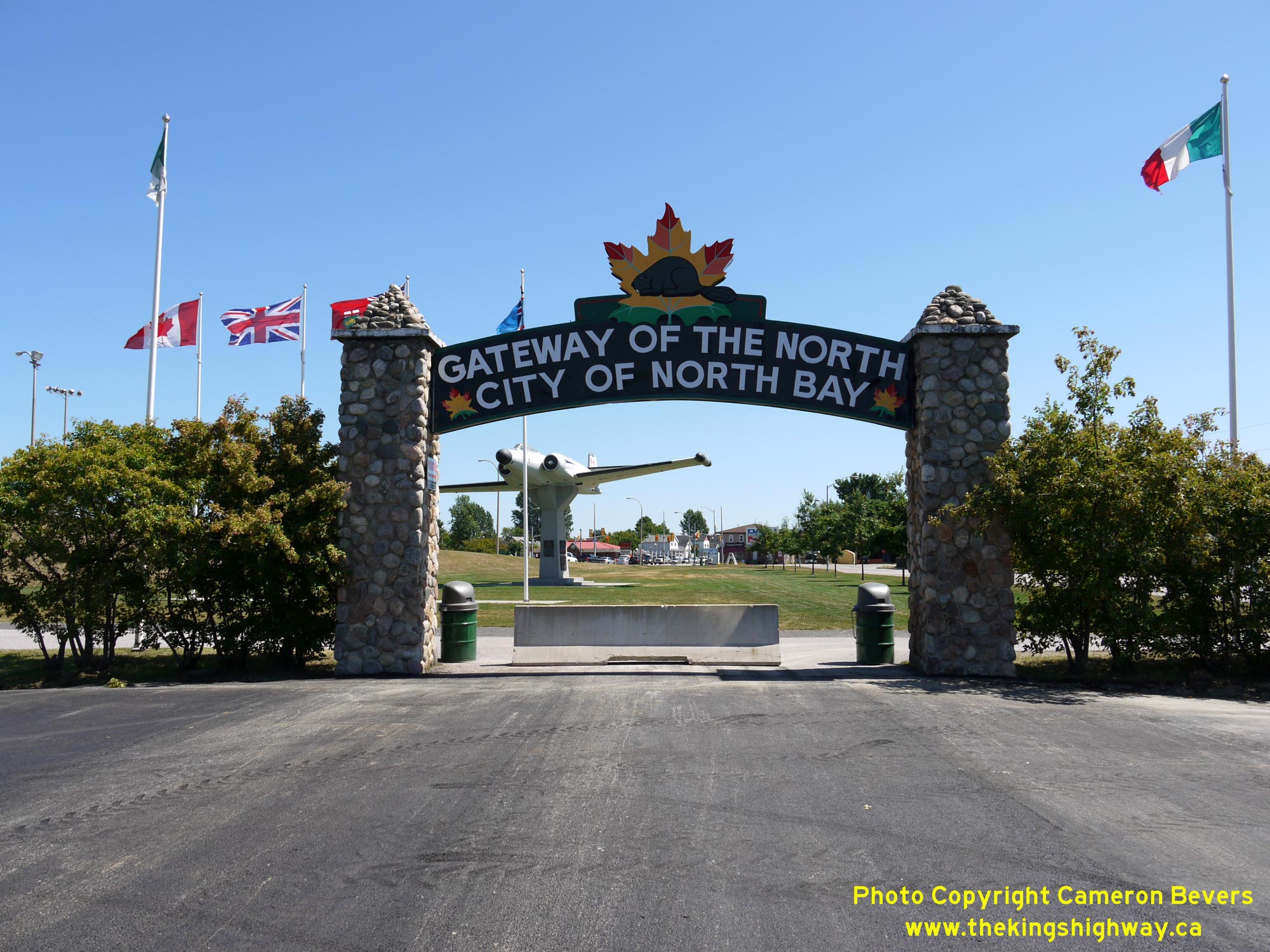 Enlarged Photo Here. (Photograph taken on July 20, 2012 - © Cameron Bevers) Right - Facing south through the North Bay Welcome Arch. In the background, one can see the intersection of Judge Avenue and Main Street/Lakeshore Drive. Prior to the completion of the adjacent North Bay Railway Overhead in the late 1960s, Hwy 11B continued straight ahead through the arch and tied into Lakeshore Drive in the background. See an Enlarged Photo Here. (Photograph taken on July 20, 2012 - © Cameron Bevers) ![]()