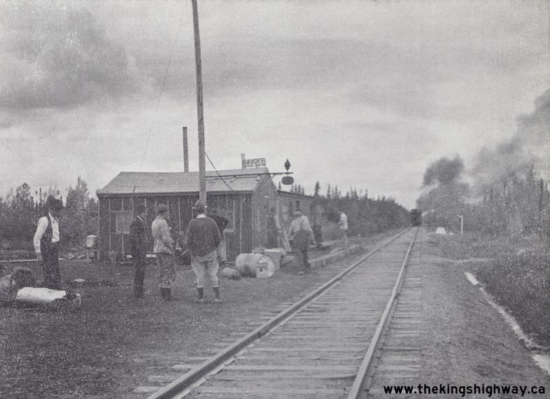 Left - Excavating muskeg along the route of the Hearst-Geraldton Highway (Hwy 11) in 1940. (Photo courtesy of Ontario Ministry of Transportation - © King's Printer for Ontario, 1940) Right - Highway workers being dropped off at Savoff Station on the Canadian National Railway (CNR) west of Hearst in 1941. Savoff was the main drop-off point for personnel and supplies during the construction of the Hearst-Geraldton Highway (Hwy 11) in 1940 and 1941. A tote road was built from Savoff southerly to the highway construction camps. Photo taken in 1941. (Photo courtesy of Ontario Ministry of Transportation - © King's Printer for Ontario, 1941) ![]()