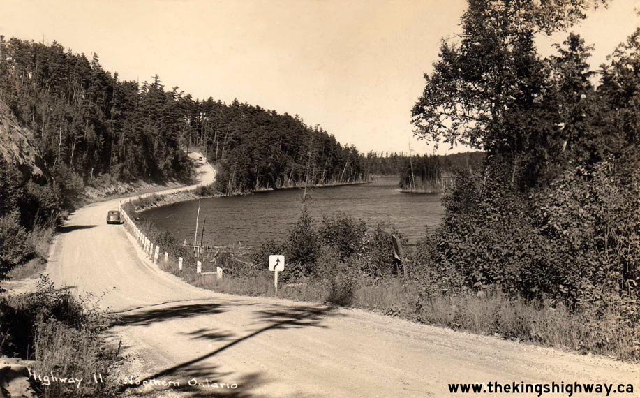 Left - Circa 1940 postcard view of Hwy 11 at Jumping Caribou Lake. See an