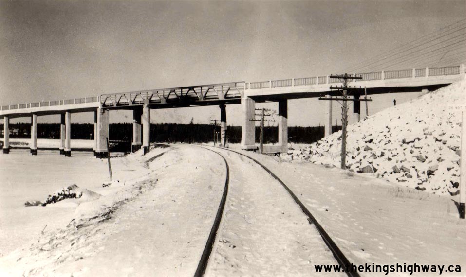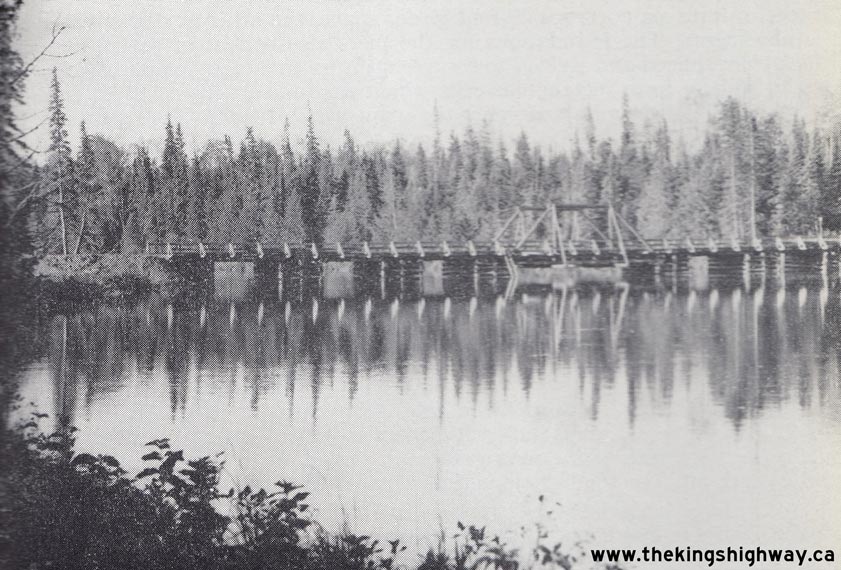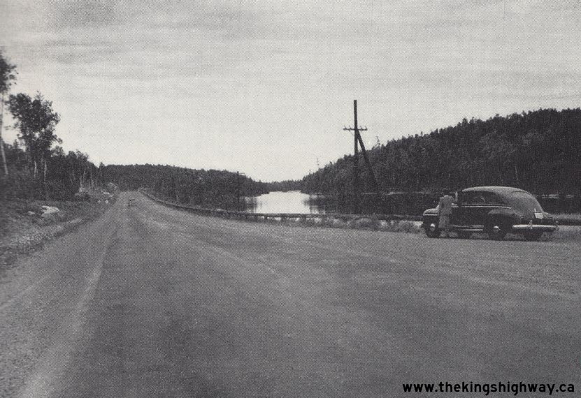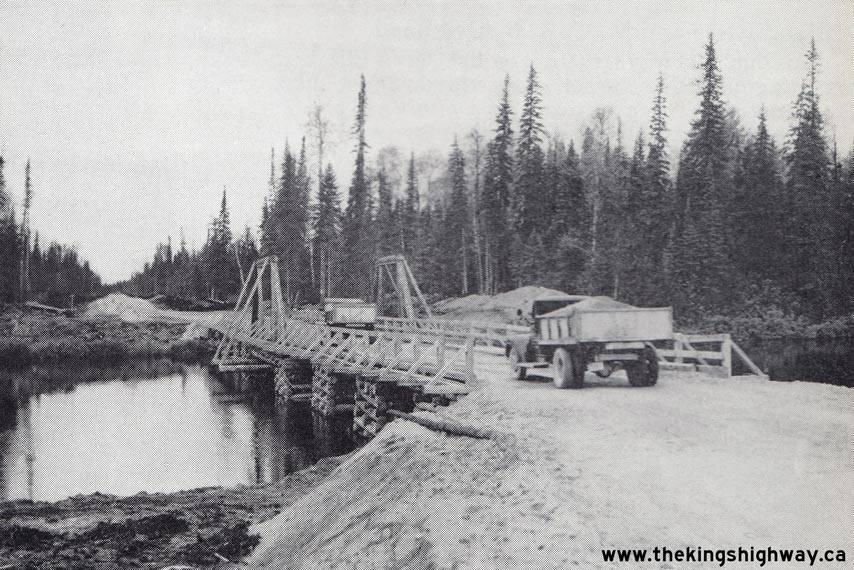 Above - A nearly-completed section of the Hearst-Geraldton Highway (Hwy 11) at the Nagagami River in 1941. Note the temporary road construction camp in the