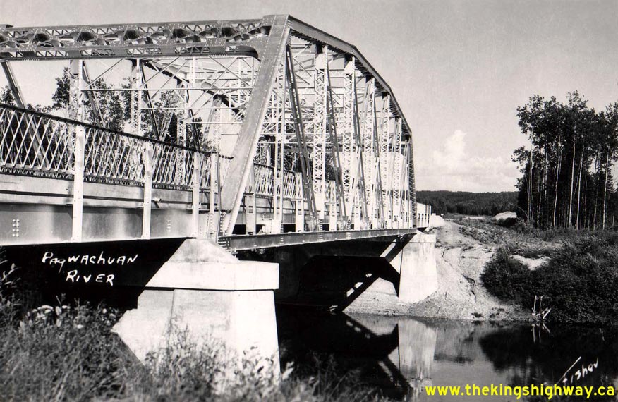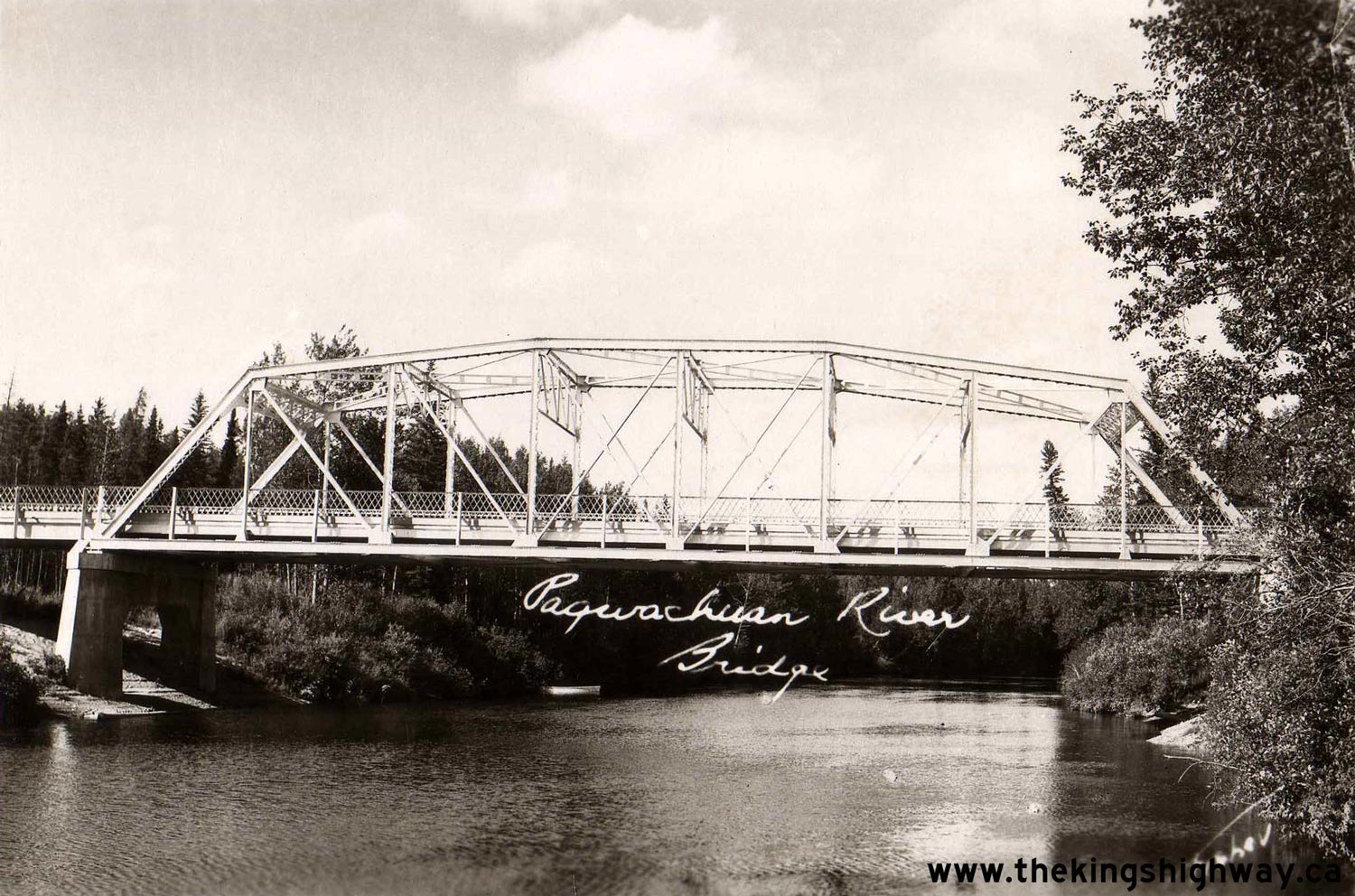 Left - Circa 1945 postcard view of the Pagwachuan River Bridge on Hwy 11 between Hearst and Longlac. See an