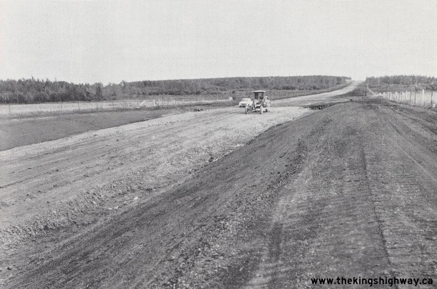 Above - Facing east along Hwy 71 (today's Hwy 11) from Pinewood, showing granular base being compacted, Contract #1955-211. See an
