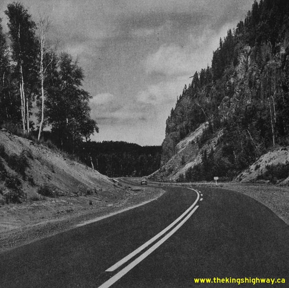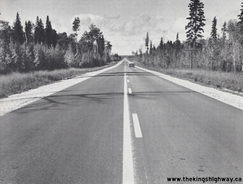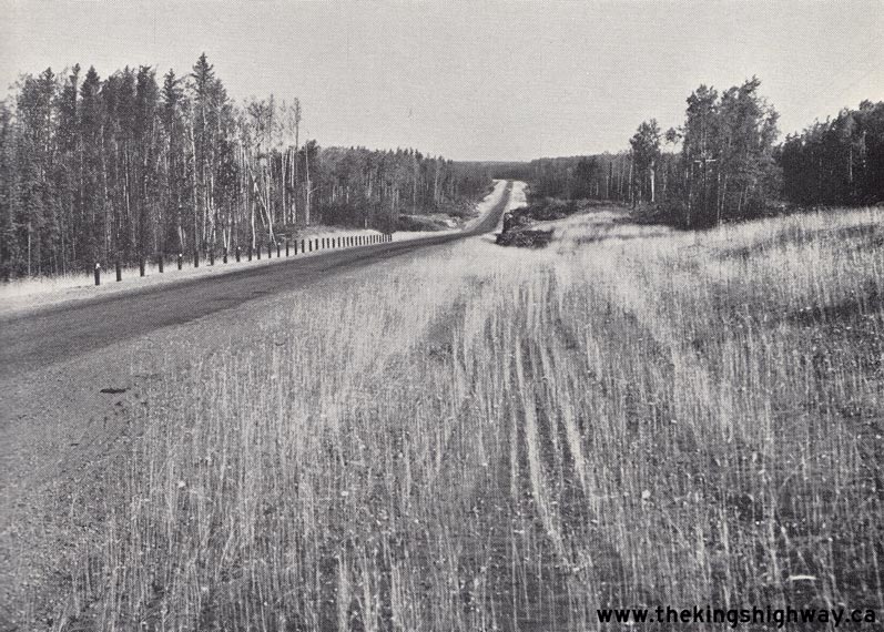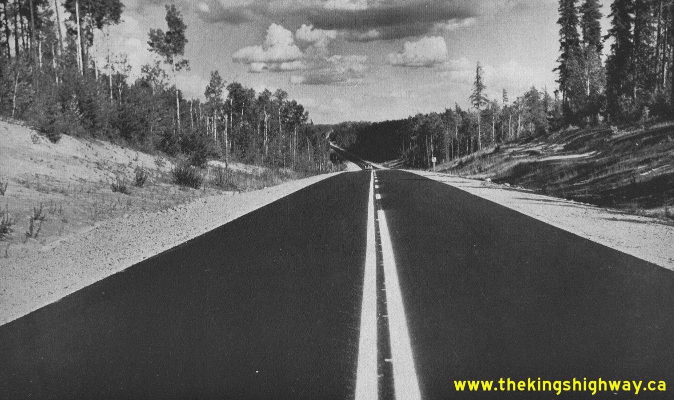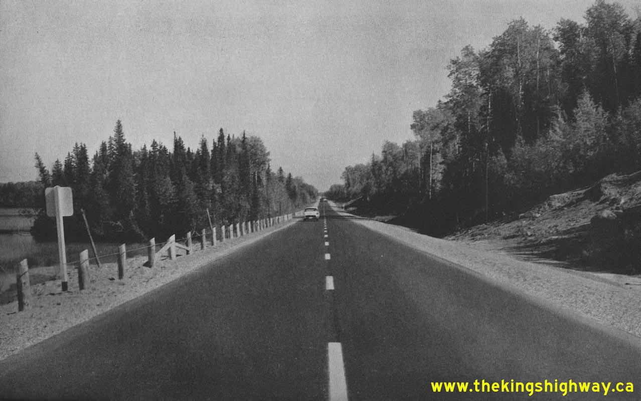 Above - Facing east along Hwy 11 near Klotz Lake between Hearst and Geraldton, showing new asphalt pavement in 1955. See an