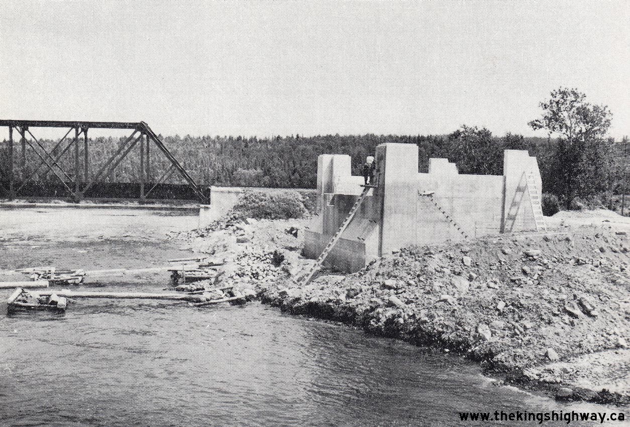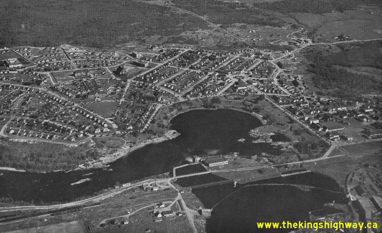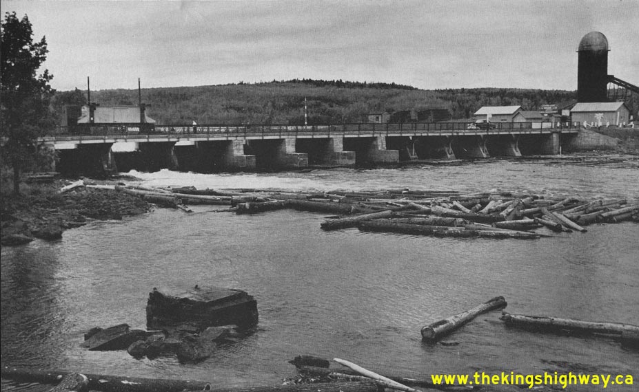 Above - Hwy 11 at the Mattagami River in Smooth Rock Falls in 1955. Traffic on Hwy 11 crossed the Mattagami River on the Smooth Rock Falls Dam until 1956, when