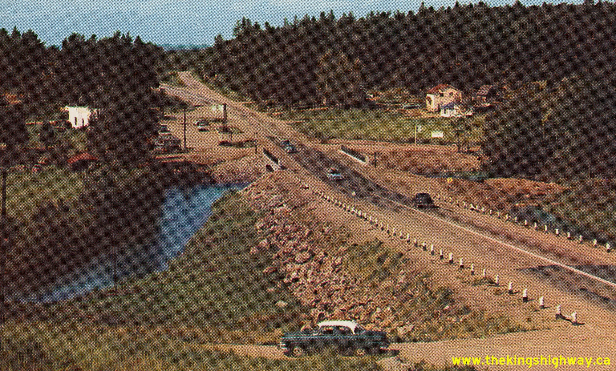 Left - Circa 1957 postcard view of Hwy 11 approaching the new Wasi River Bridge, located about 2 miles south of Callander. This bridge is located on a