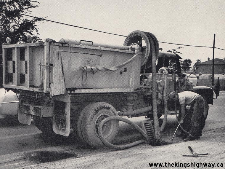 entirely new King's Highway route number, thus creating Hwy 112. Photo taken on September 4, 1952. (Photo courtesy of Ontario Ministry of Transportation - © King's Printer for Ontario, 1952) Right - Catch basin clean-out by a Department of Highways' Maintenance Crew on Hwy 11 south of Thornhill. Photo taken on August 20, 1952. (Photo courtesy of Ontario Ministry of Transportation - © King's Printer for Ontario, 1952)