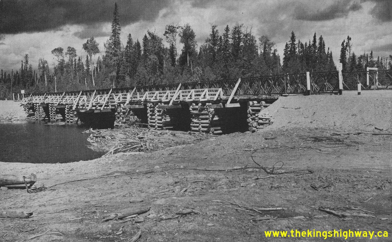 1953. See an Enlarged Photo Here. (Photo courtesy of Ontario Ministry of Transportation - © King's Printer for Ontario, 1953) Right - Shekak River Bridge on Hwy 11, 30 miles west of Hearst. Note that a Bailey Bridge was installed across the original timber beam and timber crib structure, which was constructed in 1941. Photo taken on August 16, 1953. See an Enlarged Photo Here. (Photo courtesy of Ontario Ministry of Transportation - © King's Printer for Ontario, 1953)
