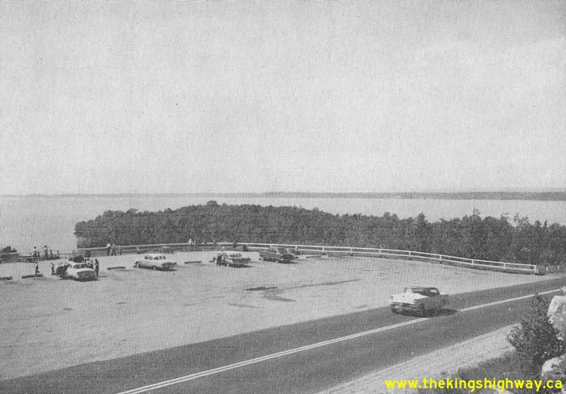 Left - Callander Bay Lookout on Hwy 11 south of North Bay (1958) (Photo courtesy of Ontario Ministry of Transportation - © King's Printer for Ontario, 1958) Right - Hwy 401 and Hwy 11 (Yonge Street) Cloverleaf in Toronto, facing north towards Richmond Hill in 1958. When the Yonge Street Interchange was first completed on Hwy 401 in 1953, it was a full eight-ramp cloverleaf. This interchange was completely reconfigured when this section of Hwy 401 was widened in 1966-1967. The full cloverleaf interchange seen here was replaced by a partial cloverleaf interchange with a directional ramp to serve the heavy eastbound Hwy 401 to northbound Hwy 11 movement. Note the Toronto Transit Commission (TTC) bus loop situated within the cloverleaf interchange. Photo taken on July 9, 1958. (Photo courtesy of Ontario Ministry of Transportation - © King's Printer for Ontario, 1958)