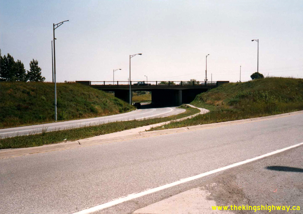 northbound leg of the rotary roadway crossing over the Queen Elizabeth Way at left, and the Toronto-bound on-ramp leading down to the Queen Elizabeth Way at right.