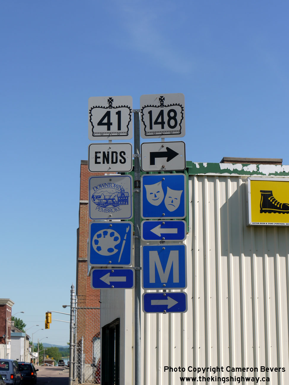 Above - Sign marking the end of Hwy 41 in Downtown Pembroke. The diminutive 6 km route of Hwy 148 begins at the Hwy 41 Junction. Like Hwy 41, the section of