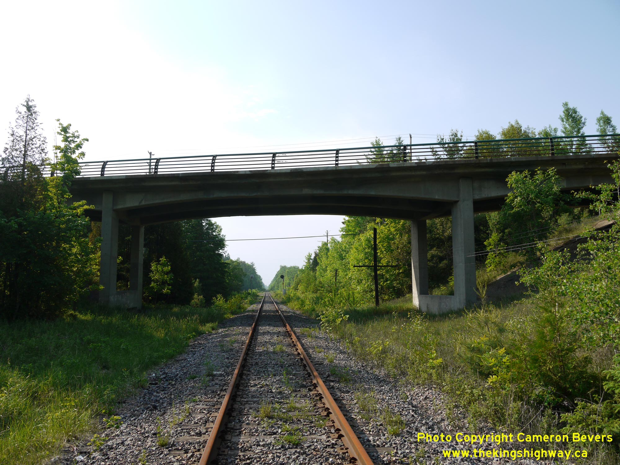 Enlarged Photo Here.(Photograph taken on June 4, 2010 - © Cameron Bevers) Right - Facing west along Hwy 148 at the Canadian Pacific Railway (CPR) Overhead (Site #29-38) east of Pembroke. See an