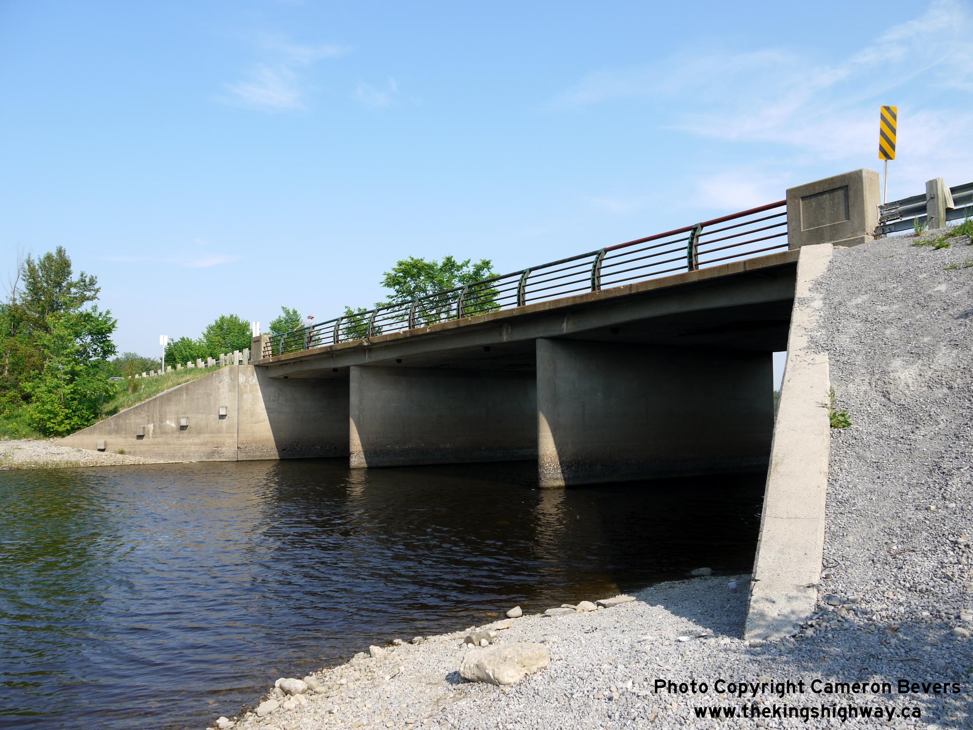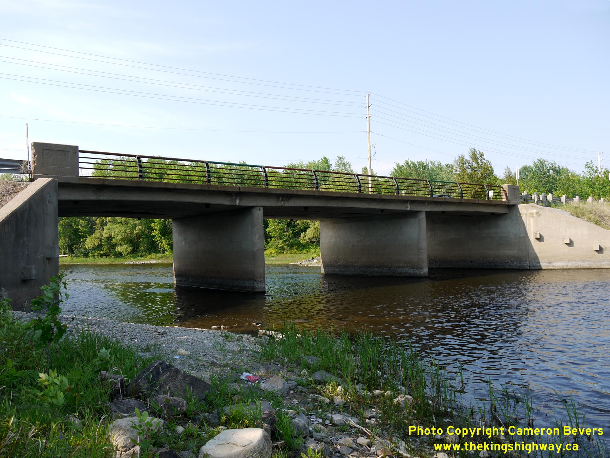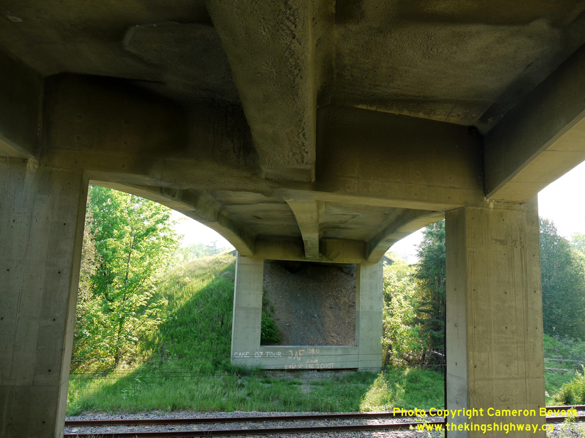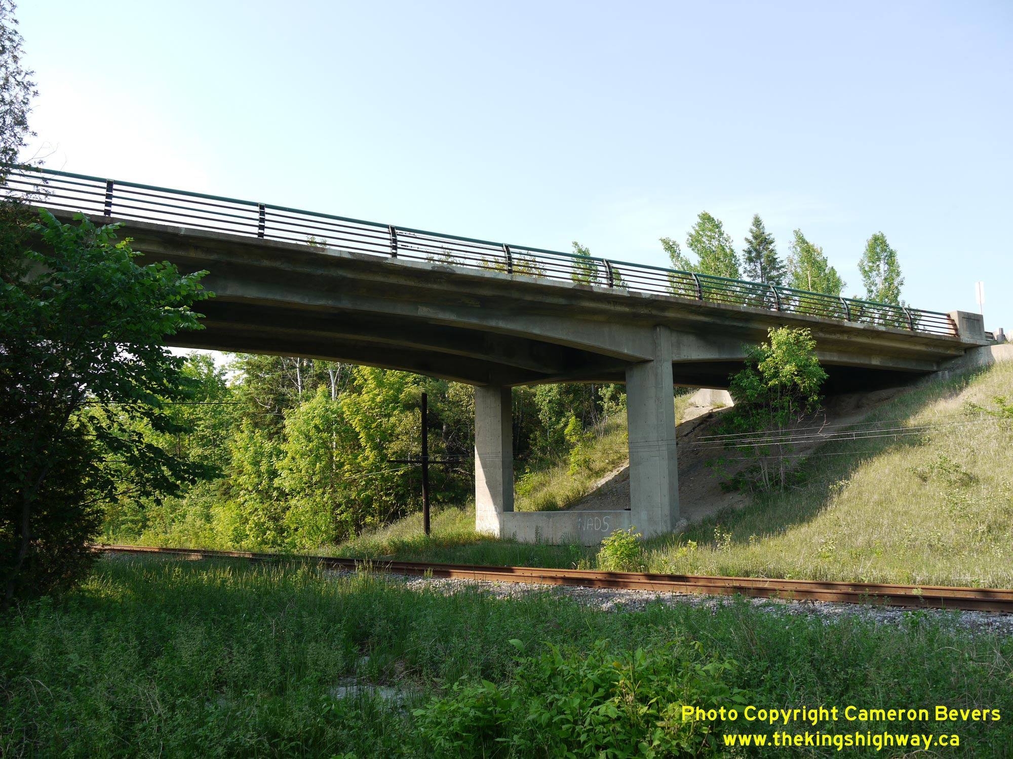 Enlarged Photo Here.(Photograph taken on May 31, 2010 - © Cameron Bevers) Right - Southern side of the CPR Overhead on Hwy 148 near Pembroke. This three-span continuous concrete girder structure was completed in 1956. See an