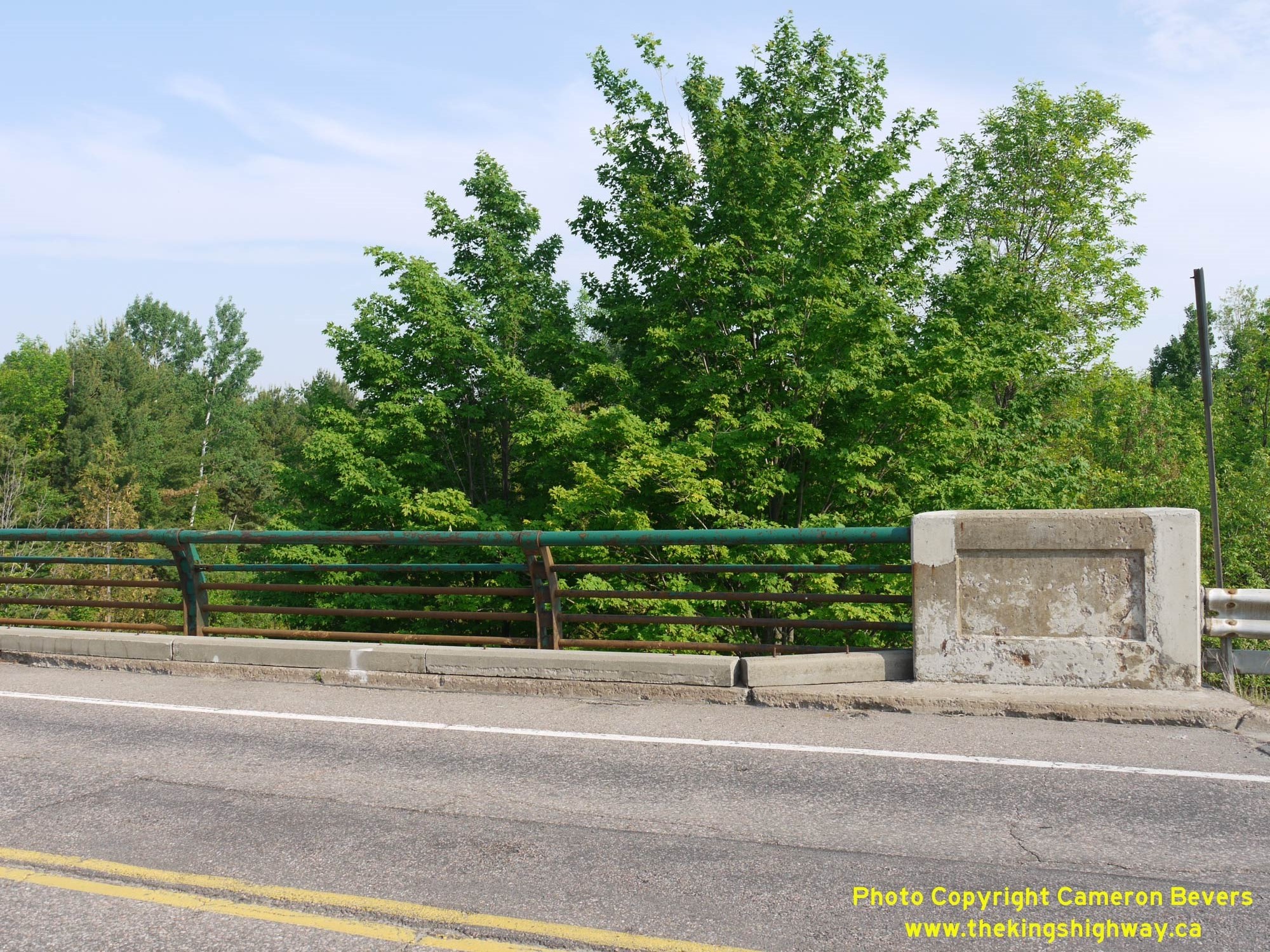 Enlarged Photo Here.(Photograph taken on May 31, 2010 - © Cameron Bevers) Right - Close-up of the unusual steel tube handrails on the Hazley Bay Bridge on Hwy 148. Both DHO-built bridges on the road leading to Des Allumettes