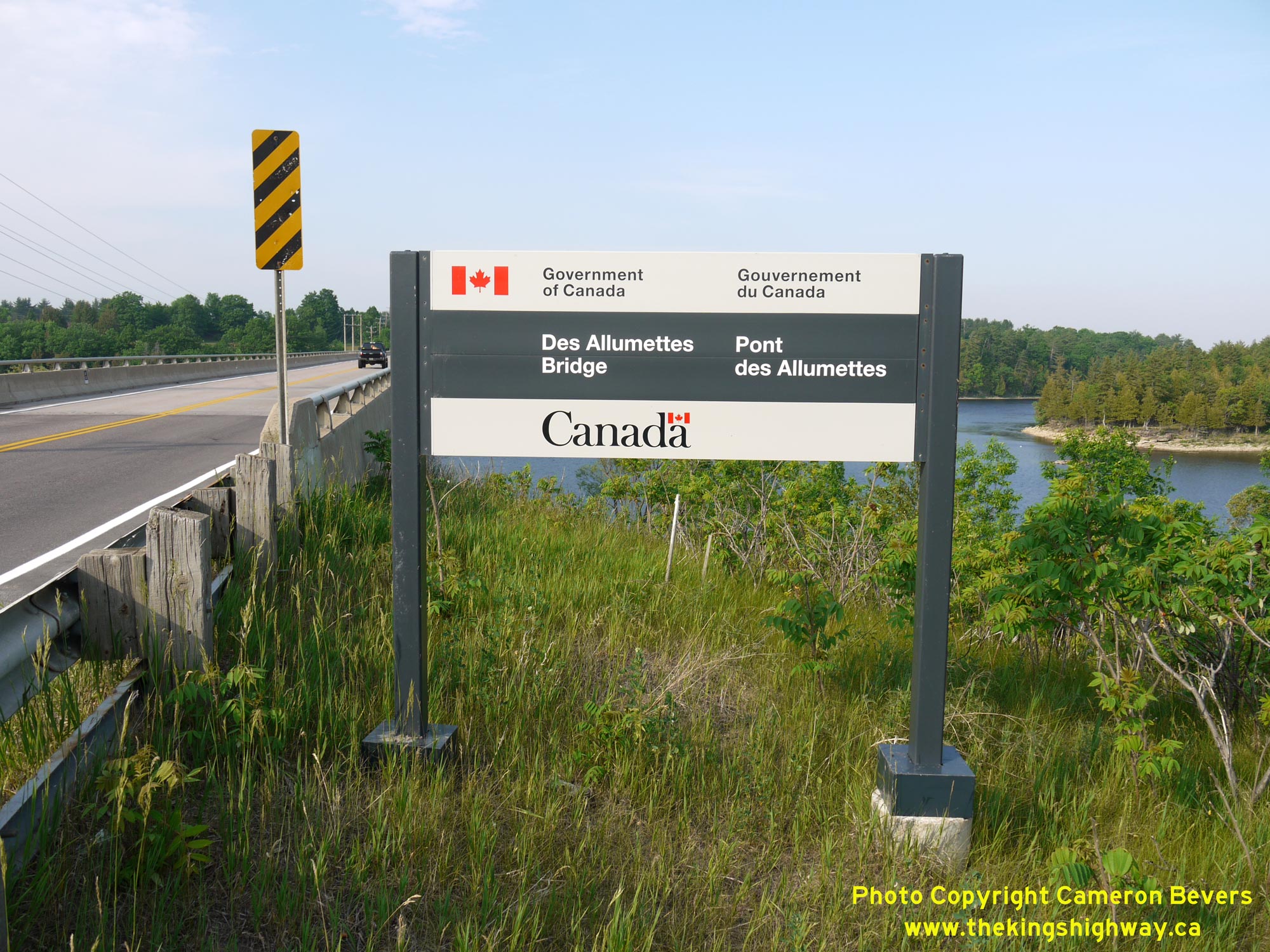 ![]() Left - Close-up of the Government of Canada sign marking Des Allumettes Bridge between Pembroke, Ontario and Waltham, Quebec. See an