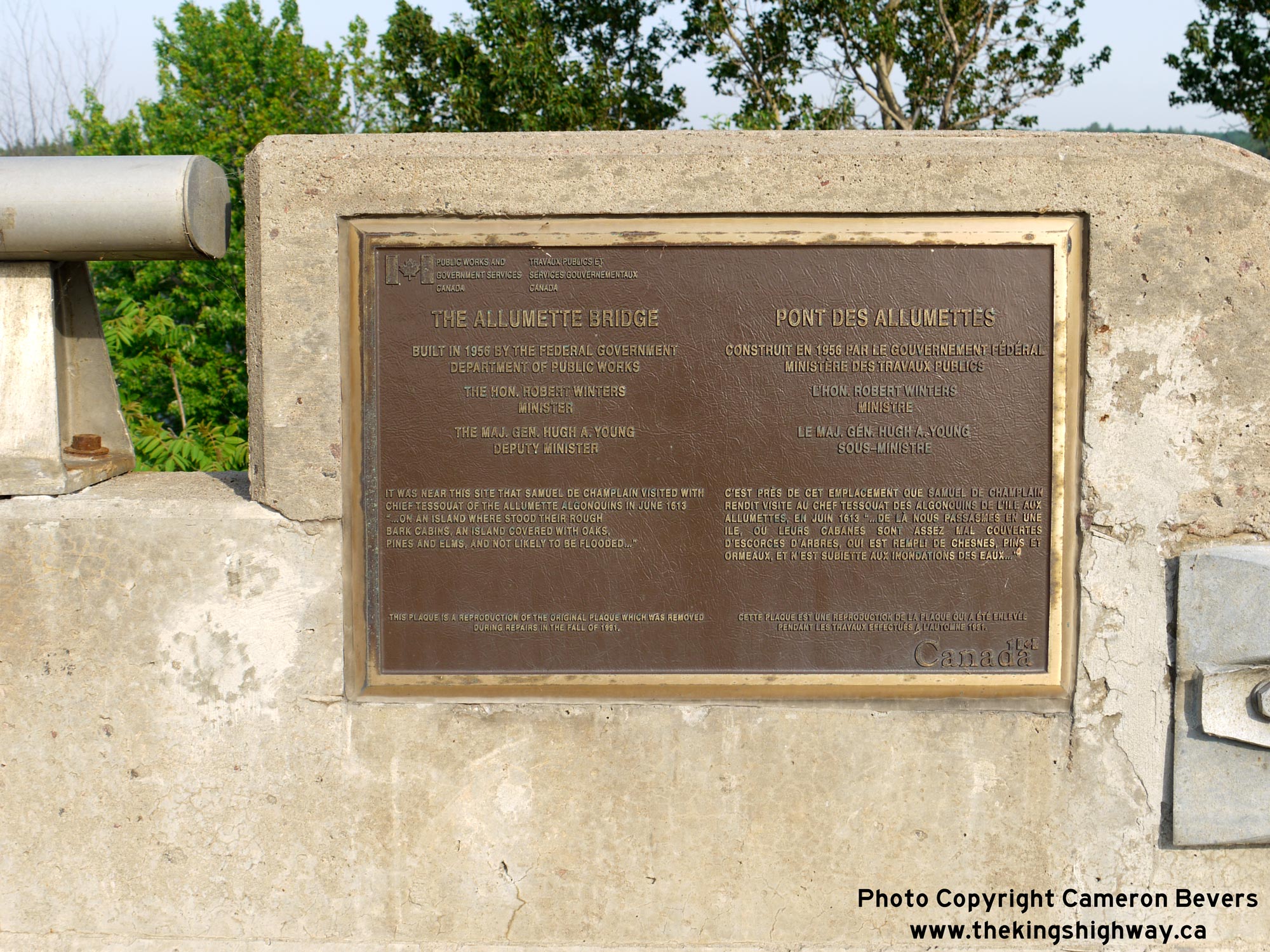 Enlarged Photo Here.(Photograph taken on May 31, 2010 - © Cameron Bevers) Right - Plaque commemorating the initial construction of Des Allumettes Bridge in 1956-1957, and subsequent rehabilitation of the bridge in 1991. This bridge