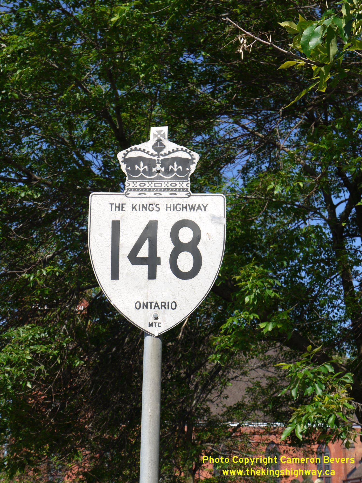 Enlarged Photo Here.(Photograph taken on June 4, 2010 - © Cameron Bevers) Right - An older King's Highway 148 route marker in Pembroke. See an