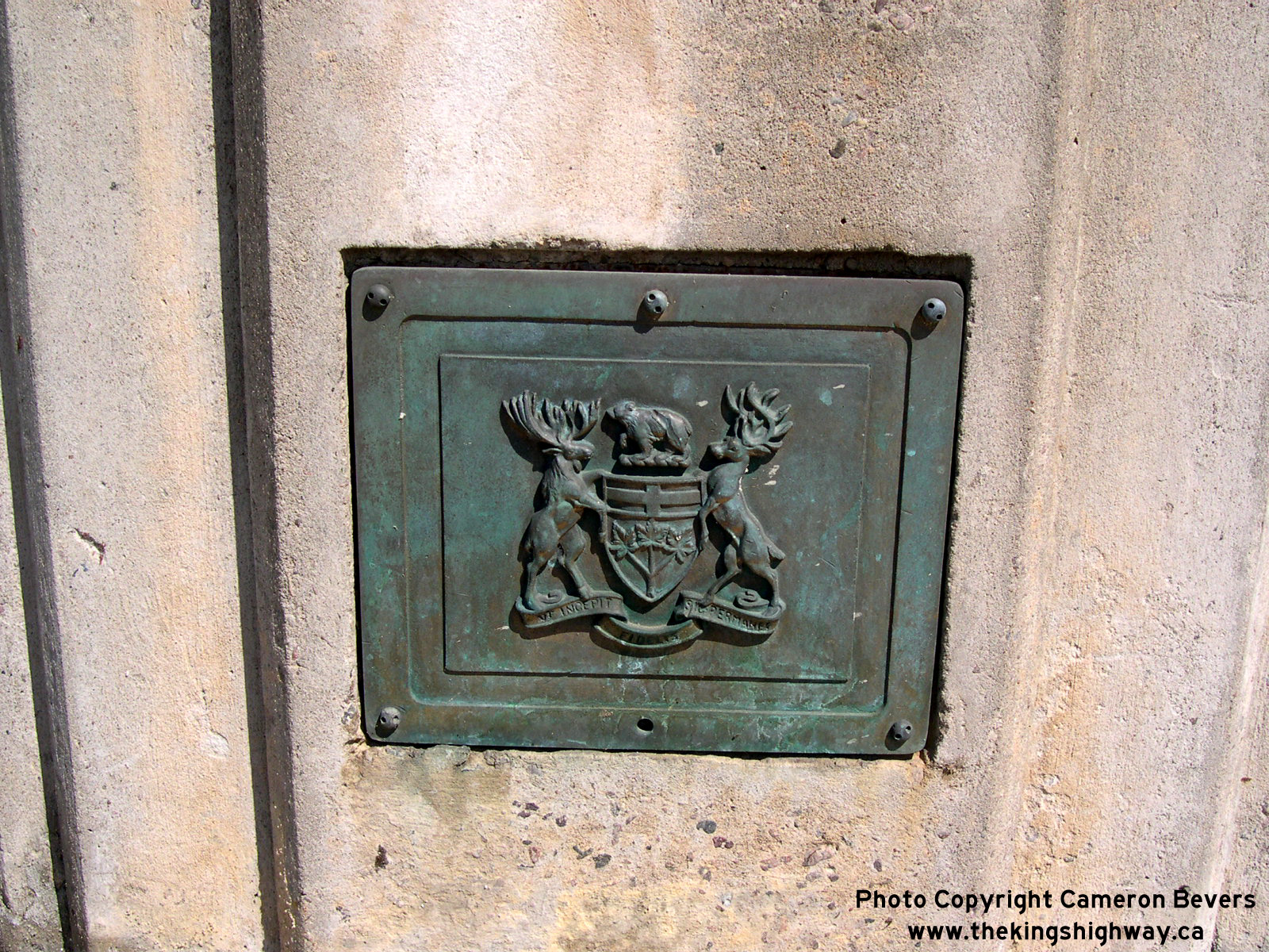 Enlarged Photo Here. (Photograph taken on August 1, 2004 - © Cameron Bevers) Right - Bronze DHO plaque on the Muskrat River Bridge on Pembroke Street (Old Hwy 17, later known as Hwy 148) in Downtown Pembroke. During the 1930s, many DHO-built bridges featured these decorative bronze plaques. Sadly, simple decorative features such as these are rarely incorporated into modern bridge designs. See an Enlarged Photo Here. (Photograph taken on August 1, 2004 - © Cameron Bevers) |