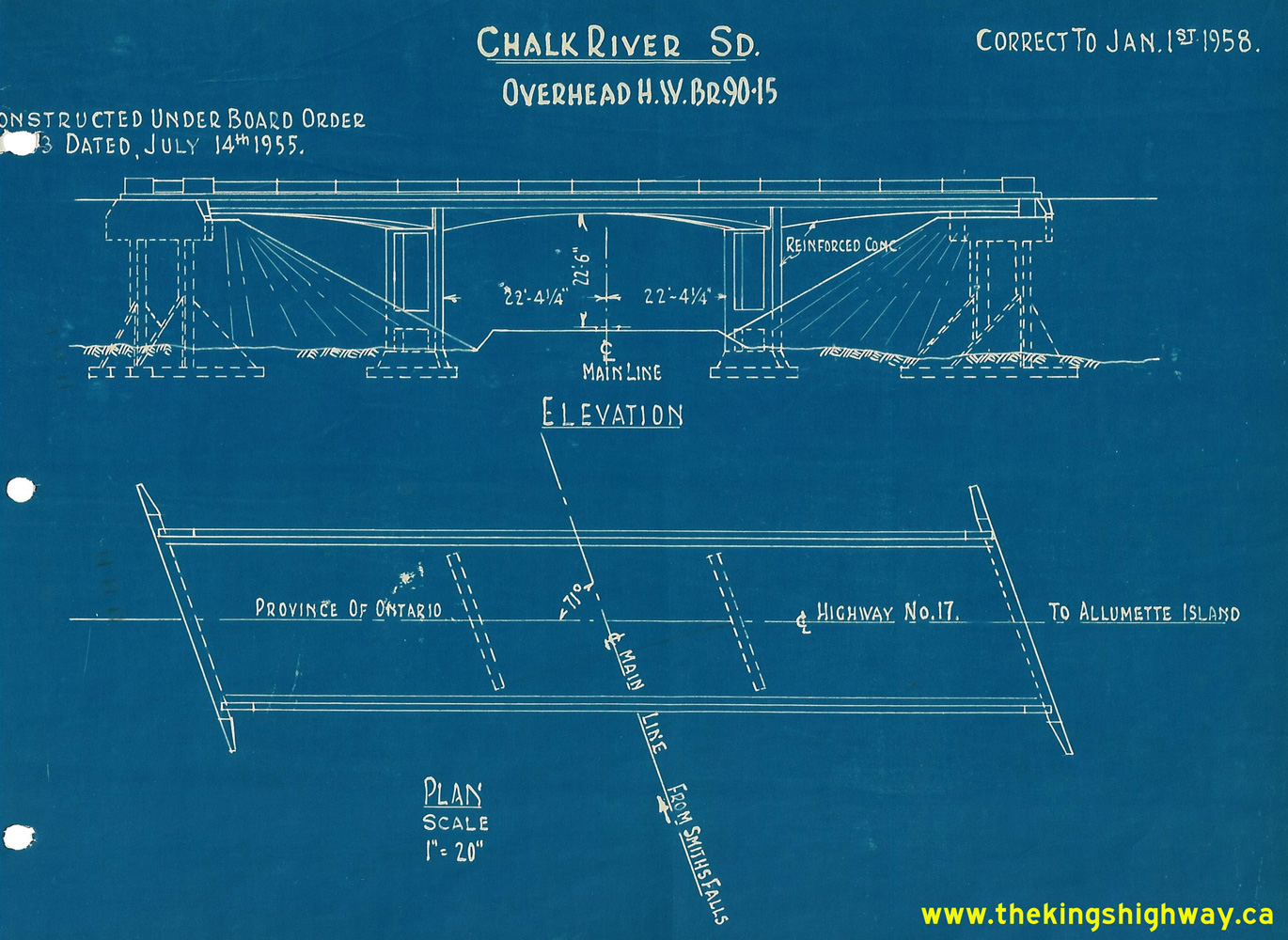 Photo taken on August 10, 1956.(Photo courtesy of Ontario Ministry of Transportation - © King's Printer for Ontario, 1956) ![]() Above - Circa 1958 CPR file drawing of Des Allumettes Road Overhead on Hwy 62 (later known as Hwy 148) southeast of Pembroke, showing as-built elevations.