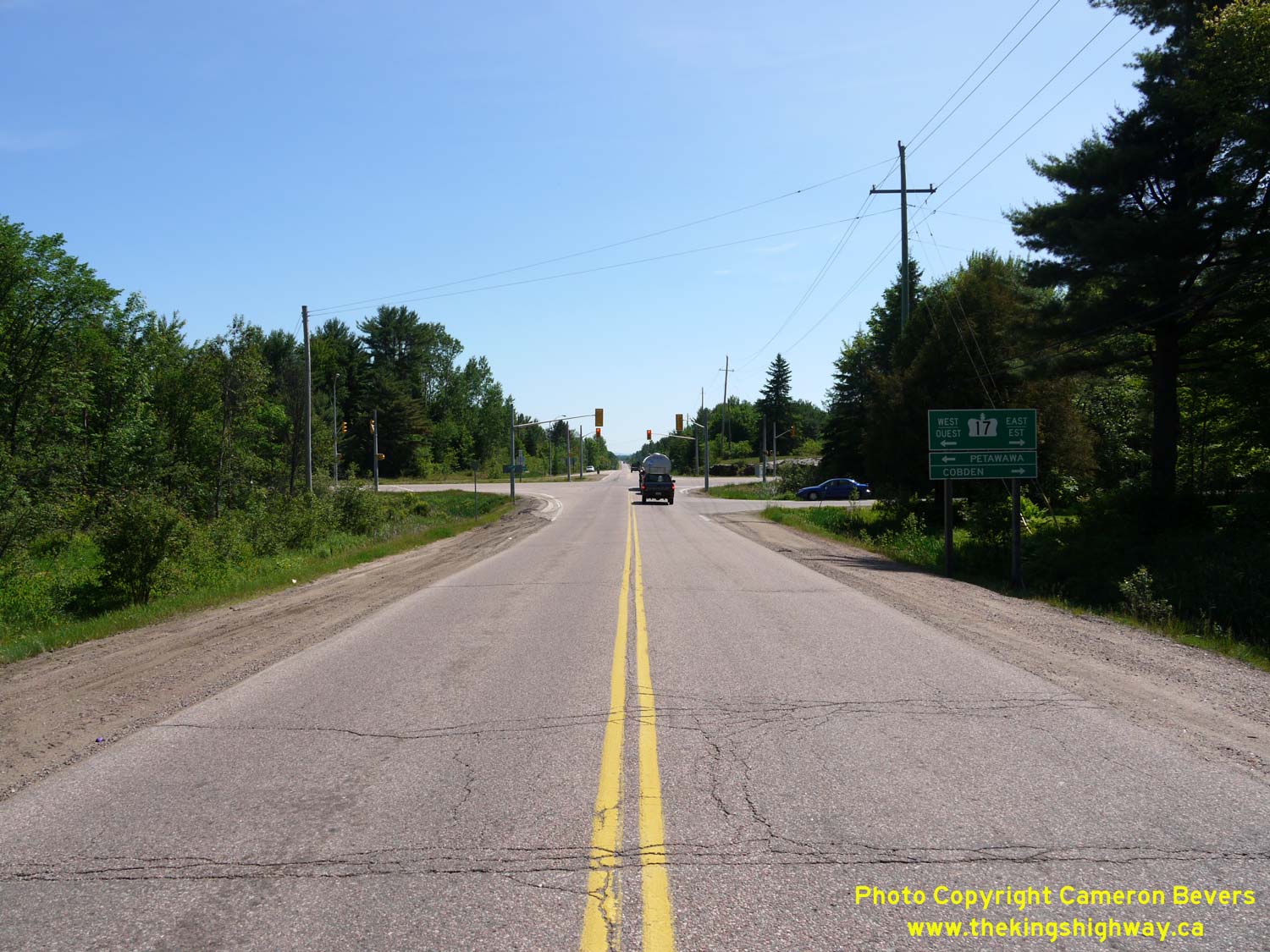 Left - Facing west along Hwy 17 towards Petawawa approaching Round Lake Road (Hwy 62 & Hwy 148) near Pembroke. Up until 1997, Round Lake Road south of the
