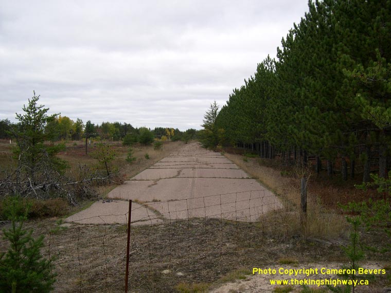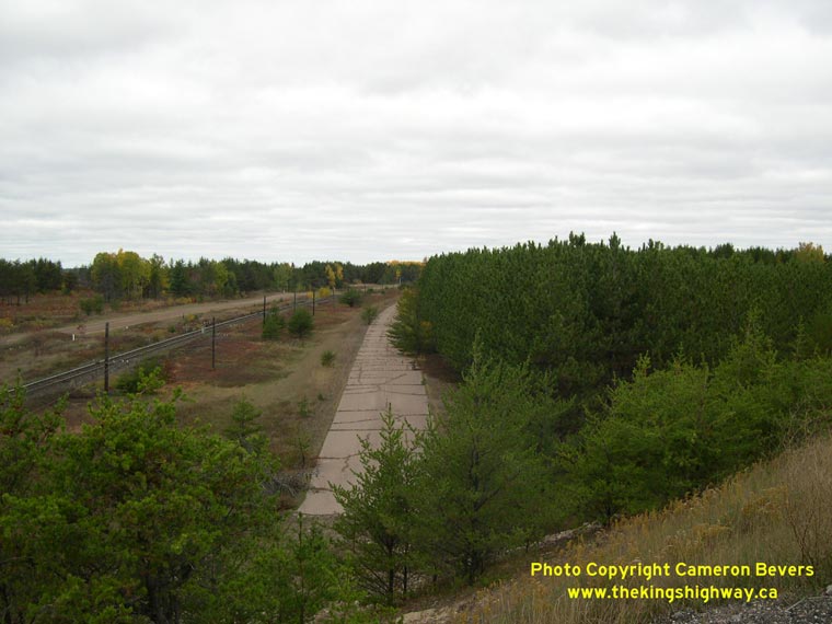 Left - Abandoned Hwy 17 alignment at C.F.B. Petawawa, facing west towards Deep River. The old highway was bypassed by a new Hwy 17 alignment in the late 1970s. (Photograph taken on October 11, 2004 - © Cameron Bevers) Right - Former Hwy 17 alignment at C.F.B. Petawawa, facing east towards Pembroke. The current route of Hwy 17 can be seen in the foreground. (Photograph taken on October 11, 2004 - © Cameron Bevers)
