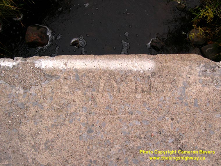 Left - Close-up of the abandoned pavement on the former Hwy 17 alignment at C.F.B. Petawawa. (Photograph taken on October 11, 2004 - © Cameron Bevers) Right - A 1937-dated concrete culvert on Hwy 17 at Chalk River. (Photograph taken on October 11, 2004 - © Cameron Bevers)