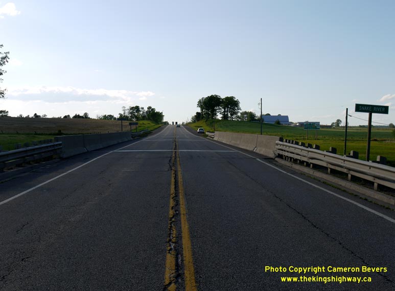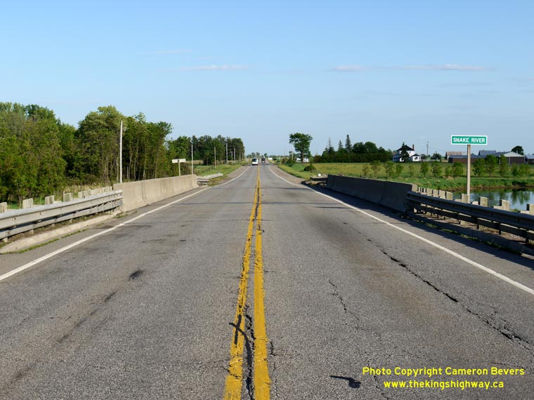 widths that did not meet Trans-Canada Highway standards. Accordingly, the steel truss bridge was replaced with a wider steel beam structure in 1961. (Photograph taken on June 1, 2010 - © Cameron Bevers) Right - Facing west along Hwy 17 at the Snake River Bridge between Cobden and Pembroke. (Photograph taken on June 1, 2010 - © Cameron Bevers)