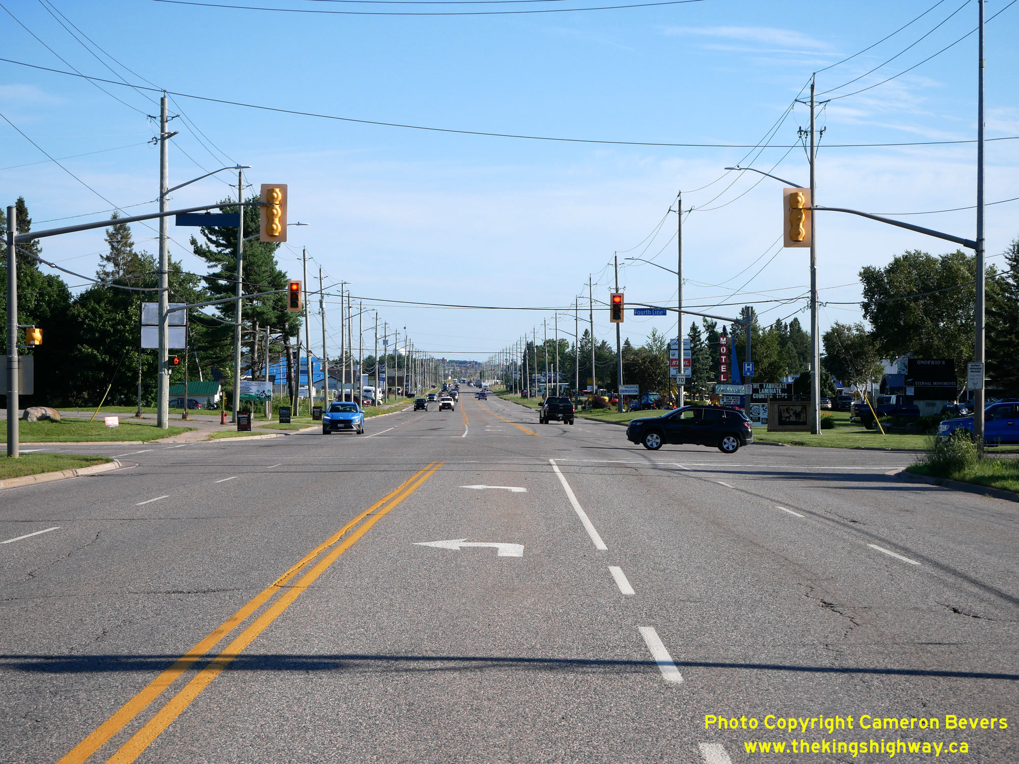 Hwy 17 at Sault Ste. Marie in order to proceed west. See an Enlarged Photo Here. (Photograph taken on September 5, 2006 - © Cameron Bevers) Right - View of the Great Northern Road (Hwy 17) in Sault Ste. Marie, facing south from Fourth Line. Within this part of the city, Hwy 17 has a five-lane