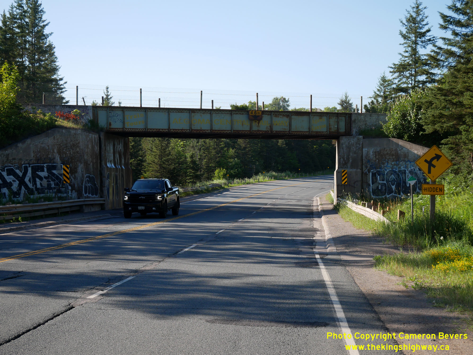 the original route of Hwy 17. See an Enlarged Photo Here.(Photograph taken on July 28, 2023 - © Cameron Bevers) Right - Facing south along Hwy 17 through the Algoma Central Railway Subway. Construction began on this railway grade separation in the late 1950s along a new