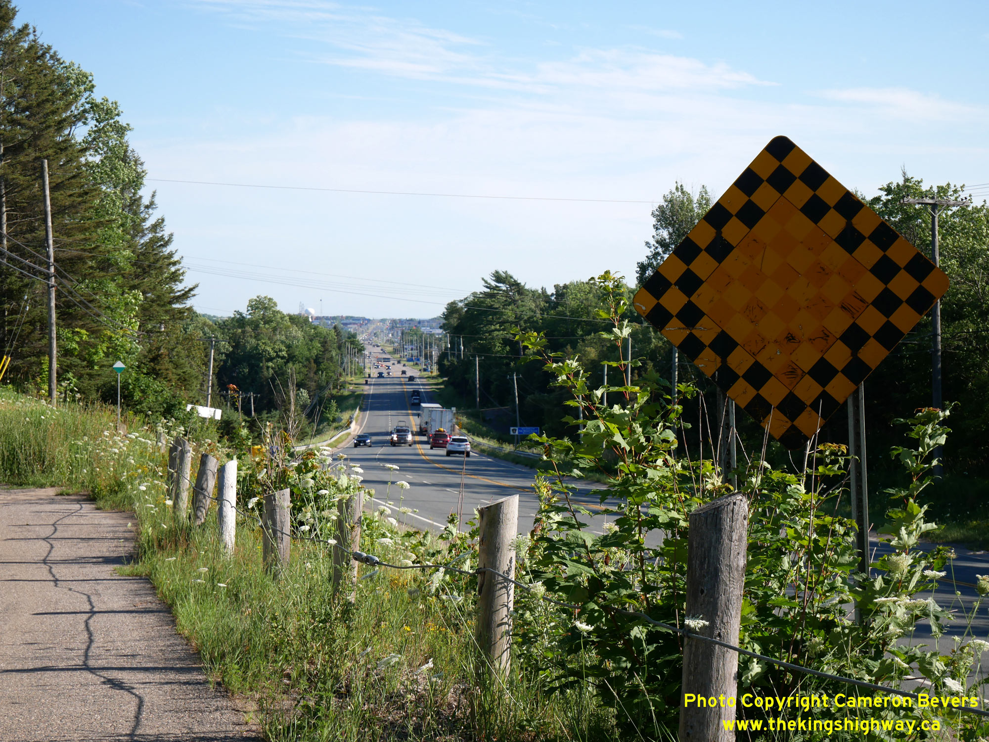 ![]() Left - A checkerboard sign marks the end of Old Hwy 17 at Odena. The relocated route of Hwy 17 lies several metres below the old highway. Prior to the