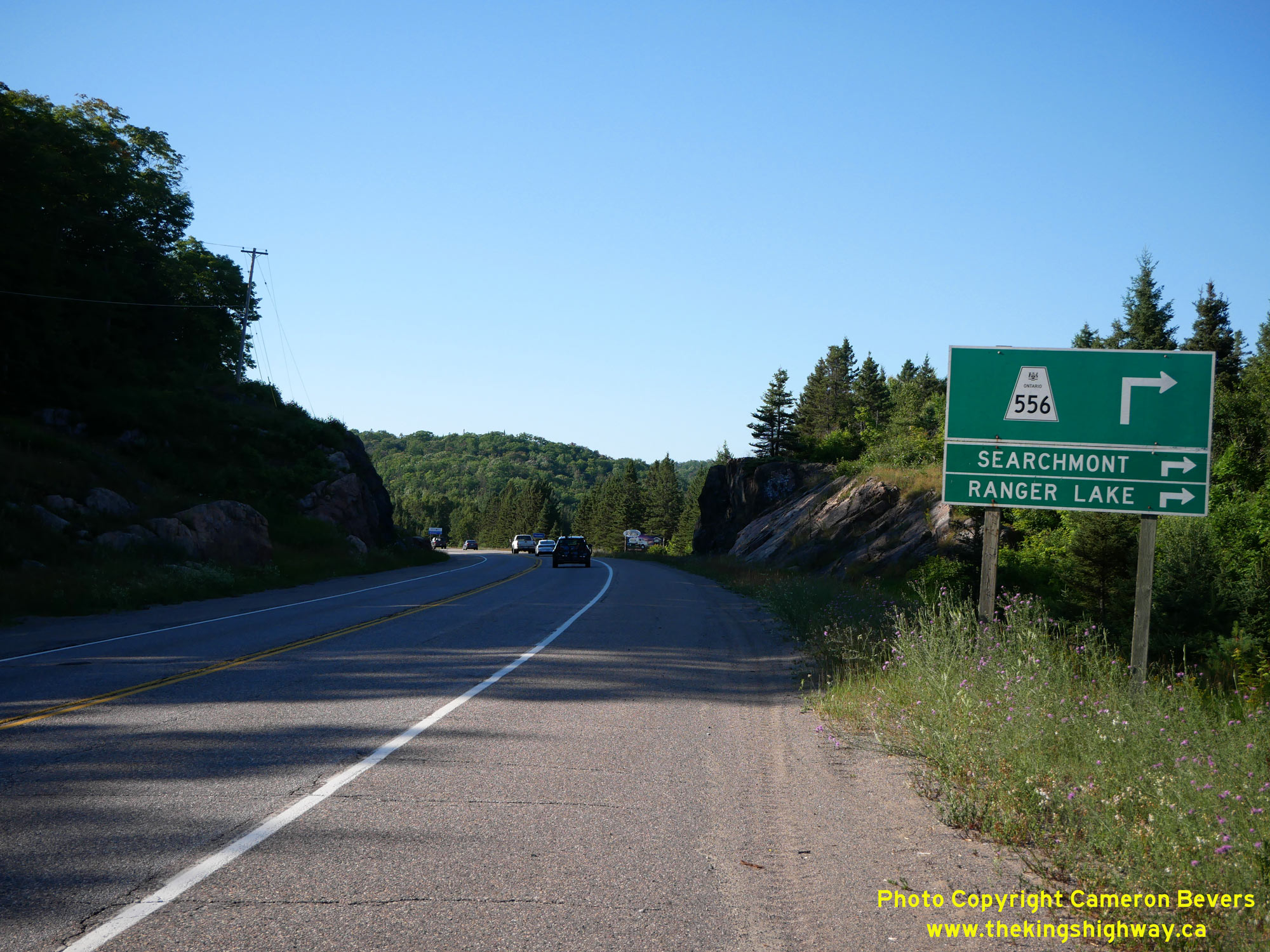 Enlarged Photo Here.(Photograph taken on July 28, 2023 - © Cameron Bevers) Right - Junction sign assembly for Hwy 556 on northbound Hwy 17 at Heyden. Interestingly, the section of Hwy 556 between Heyden and Island Lake was originally