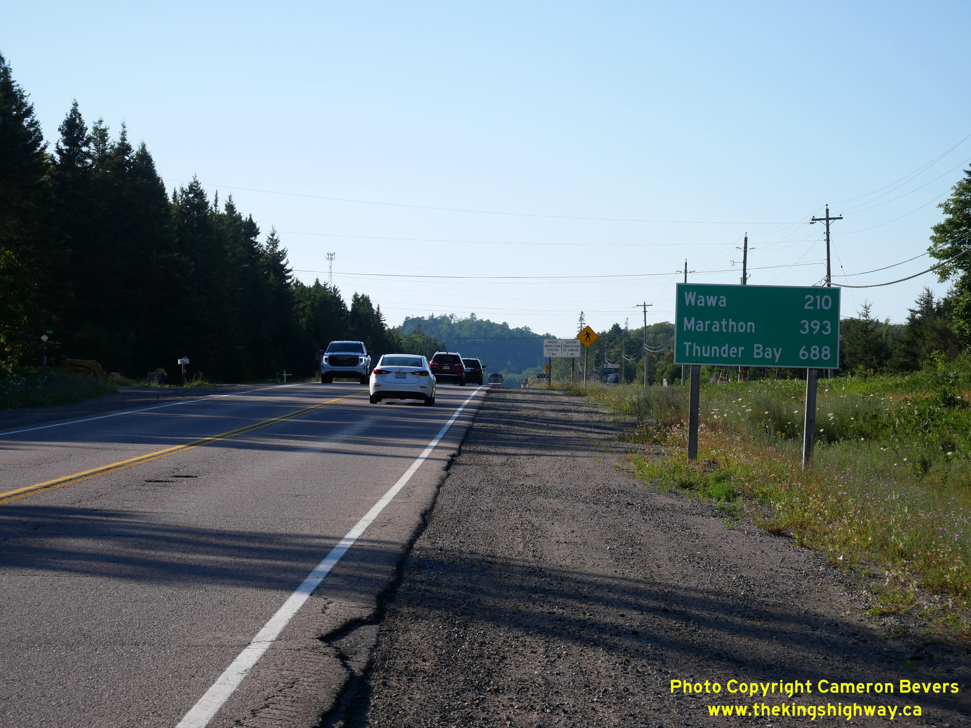Enlarged Photo Here.(Photograph taken on July 28, 2023 - © Cameron Bevers) Right - View of Hwy 17 at Heyden, facing north towards Wawa from the Hwy 556 Junction. This section of Hwy 17 is actually a diversion of the original highway.