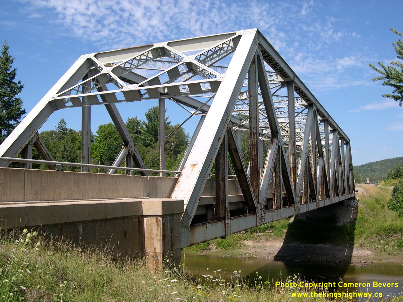 Left - Goulais River Bridge on Hwy 17 north of Sault Ste. Marie. This single-span steel through truss structure was built under Contracts #1958-177 (structural
