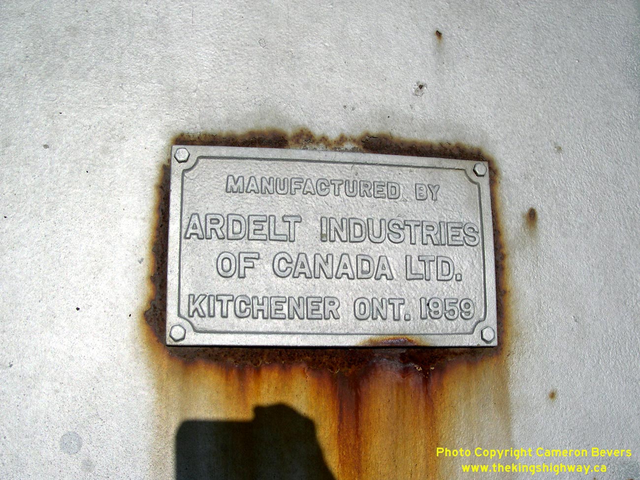 Heyden-Goulais River Diversion. See an Enlarged Photo Here. (Photograph taken on September 1, 2008 - © Cameron Bevers) Right - Bridge manufacturer's plaque on the Goulais River Bridge on Hwy 17. To my knowledge, this is the only steel truss bridge manufactured by Ardelt Industries Ltd. on a King's Highway. The Goulais River Bridge was part of a major highway realignment project, which saw about 12 km of Hwy 17 relocated north of Heyden. See an Enlarged Photo Here. (Photograph taken on September 1, 2008 - © Cameron Bevers)