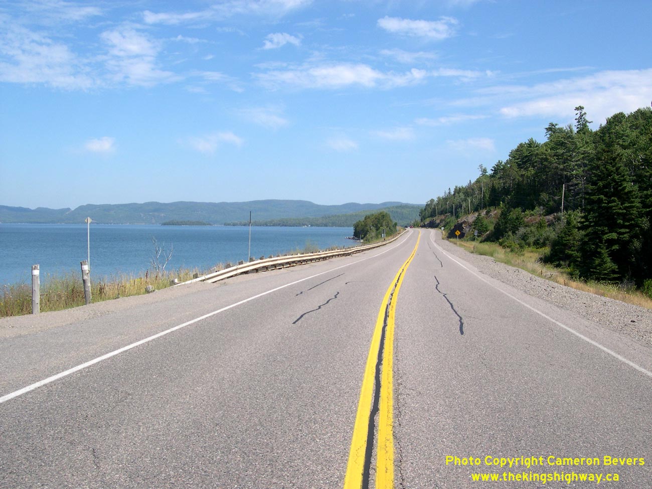 Left - Facing south along Hwy 17 across the Havilland Bay Causeway, north of Sault Ste. Marie. Traces of the original 1930s alignment of Hwy 17 can be seen