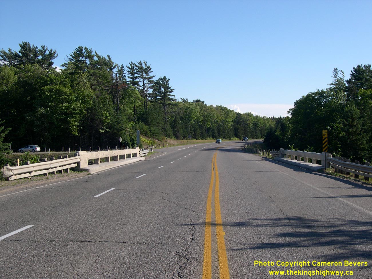 Left - Facing north along Hwy 17 towards the Root River Bridge in Sault Ste. Marie. This is the second of four crossings of the Root River along Hwy 17 north