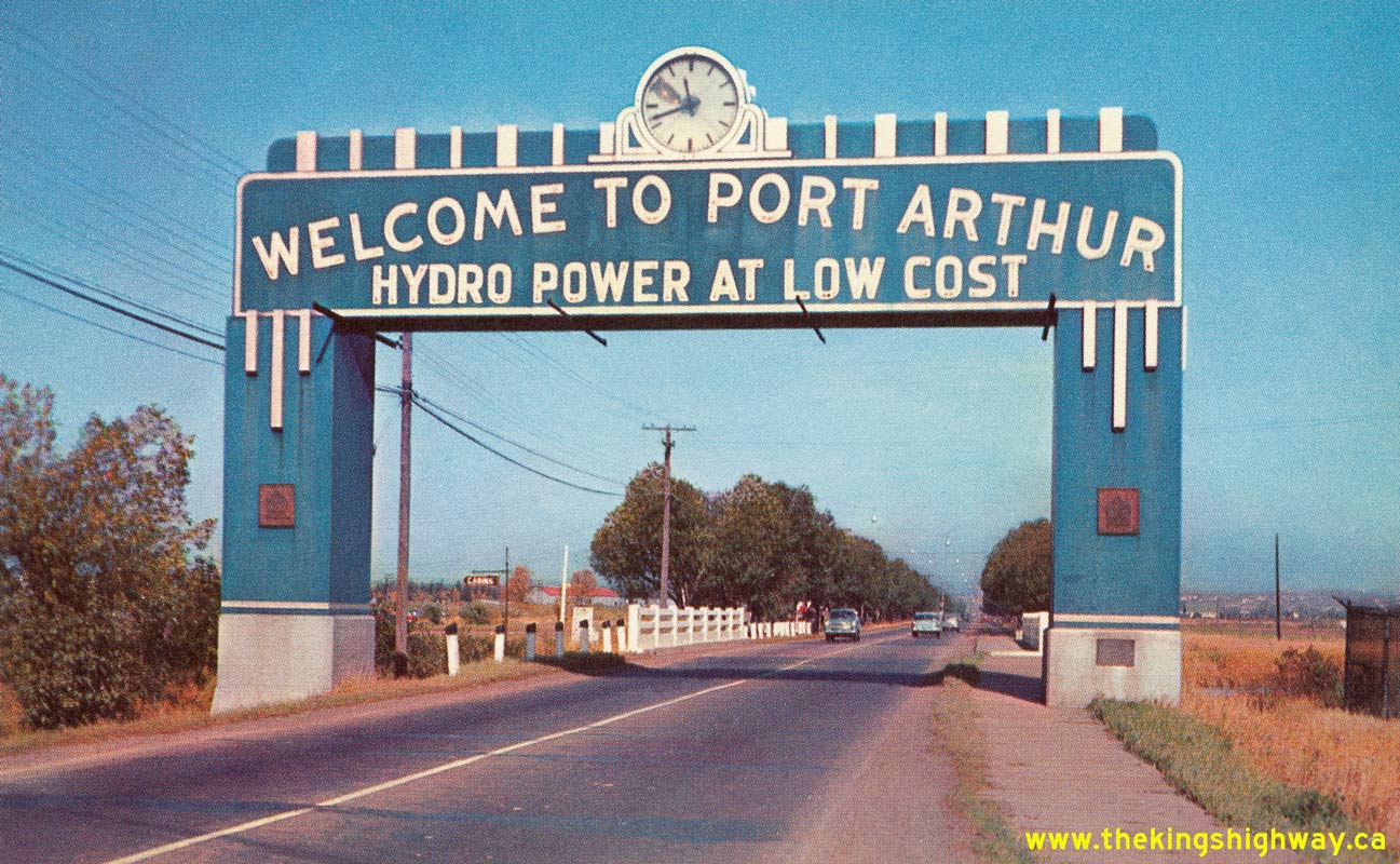 Above - Circa 1955 postcard view of the Port Arthur Welcome Arch on Hwy 17 (Memorial Avenue). This early colour postcard shows the original blue-and-white