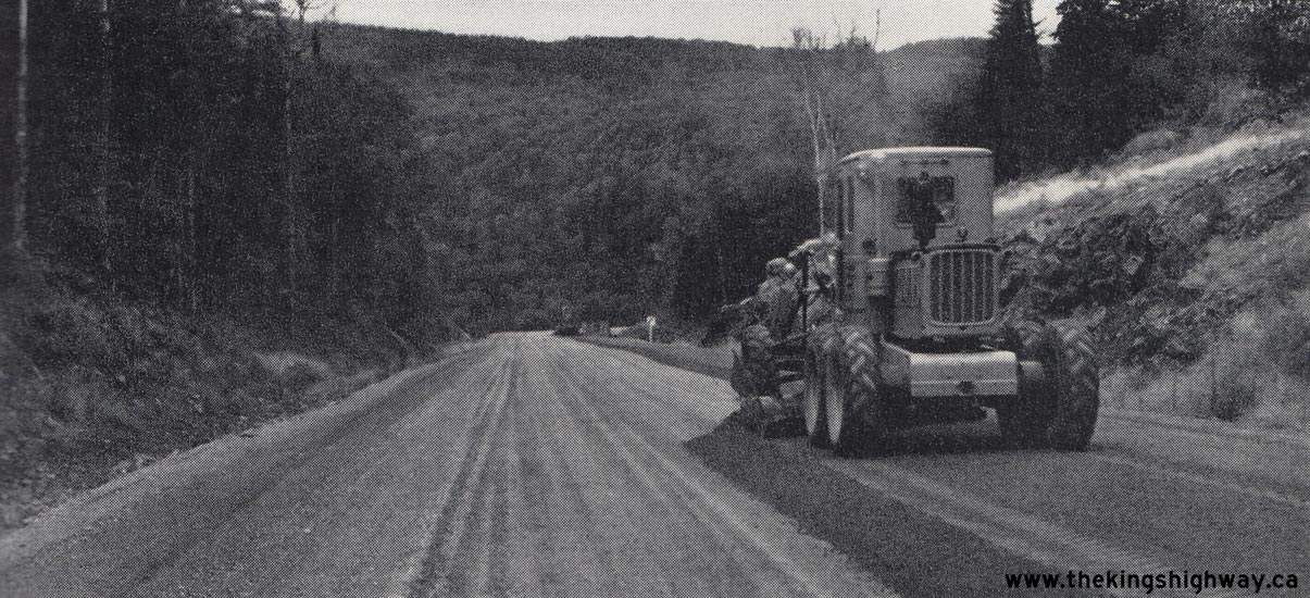 Above - Grader laying a fresh granular surface on an extension of Hwy 17, 8 miles west of Marathon. Photo taken on September 7, 1955. (Photo courtesy of Ontario Ministry of Transportation - © King's Printer for Ontario, 1955)